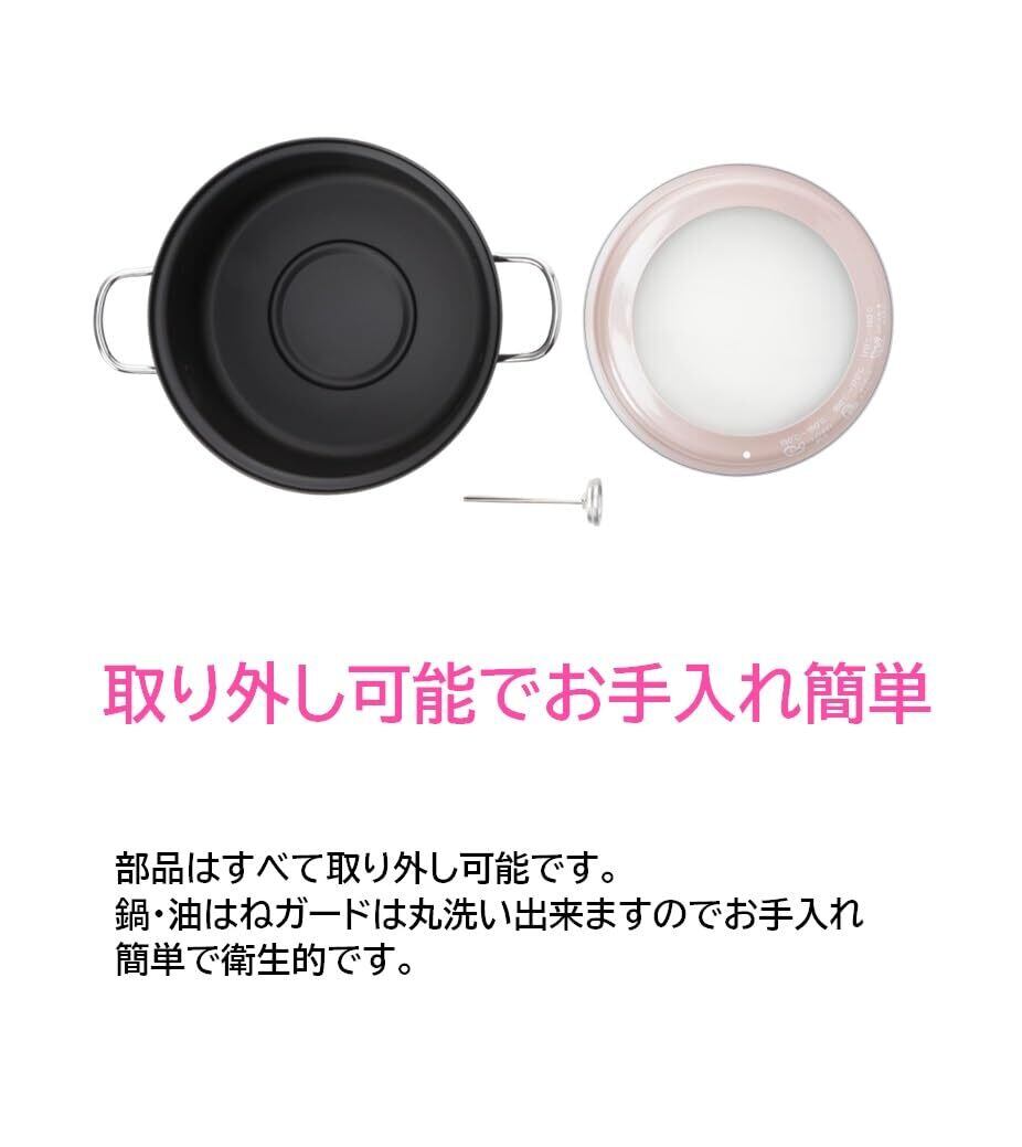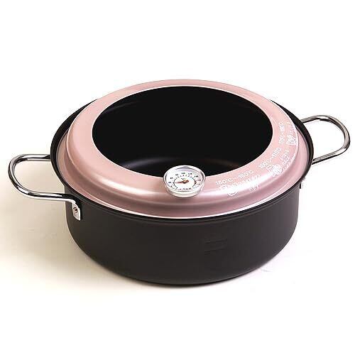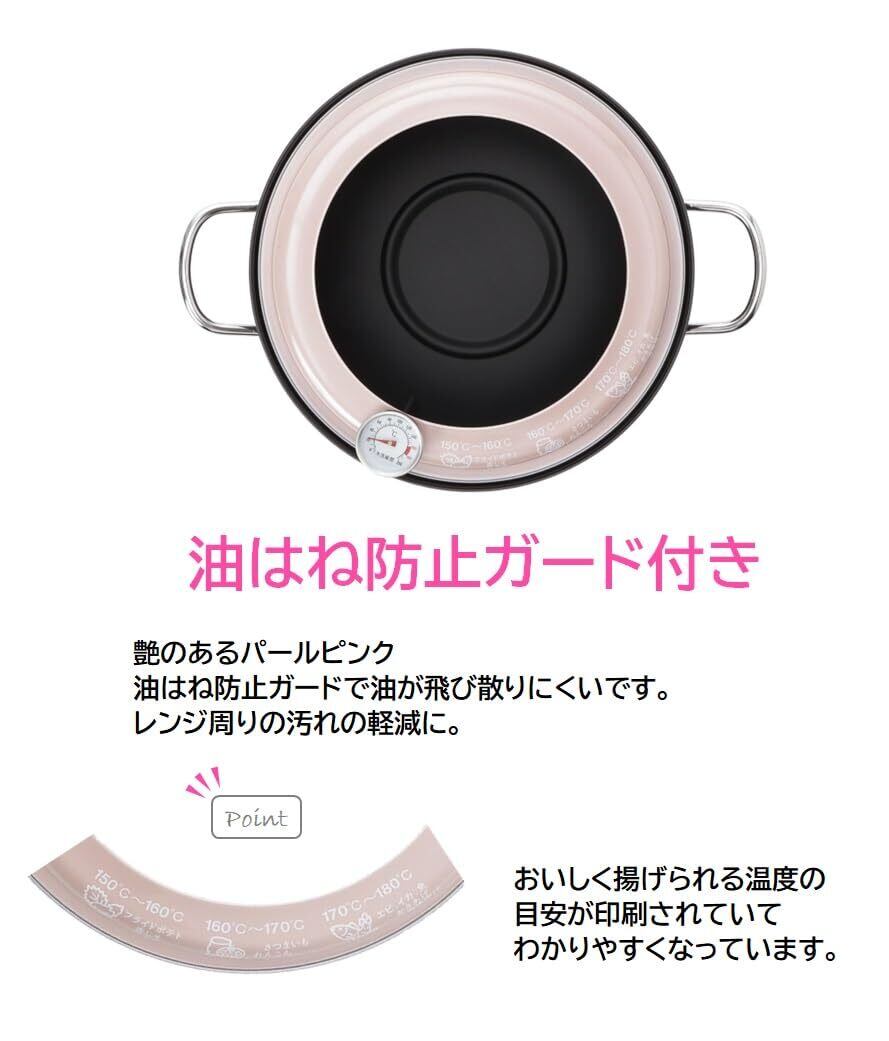 フード付きデザインは、揚げ物の調理中の油はねを防ぎ、周囲を汚さずに調理ができます。持ちやすいハンドルで、熱い鍋でも安心して持ち運べます。温度計も料理に活用しやすい位置に配置されており、直感的に使用できるのが特徴です。また、内側には油量目盛りがあり、簡単に油の量を測れます。
