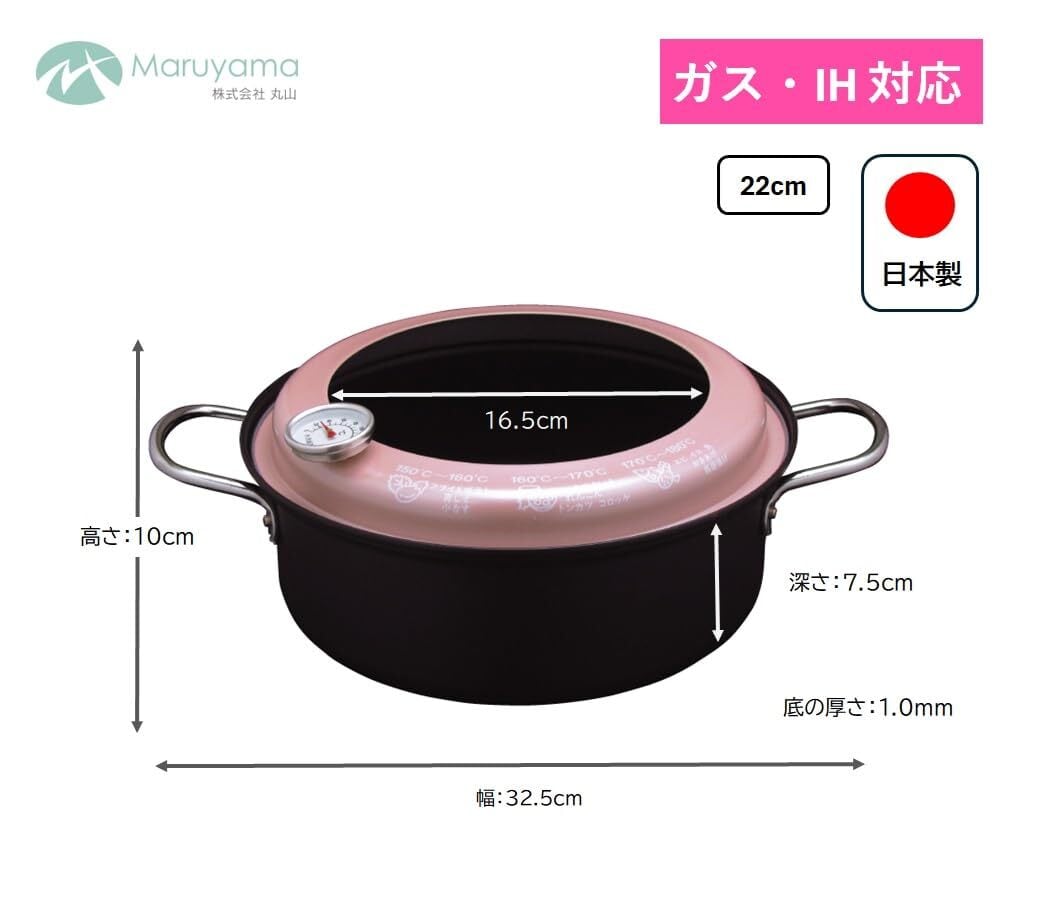 こちらの[丸山 鉄製 天ぷら鍋]は、22cmのサイズで、家庭で気軽に本格的な揚げ物が楽しめるアイテムです。フード付きで油の飛び散りを防ぎ、揚げ物がきれいに仕上がります。さらに、温度計もついており、油温の管理が簡単にできるため、揚げ物初心者でも安心して使用できます。
