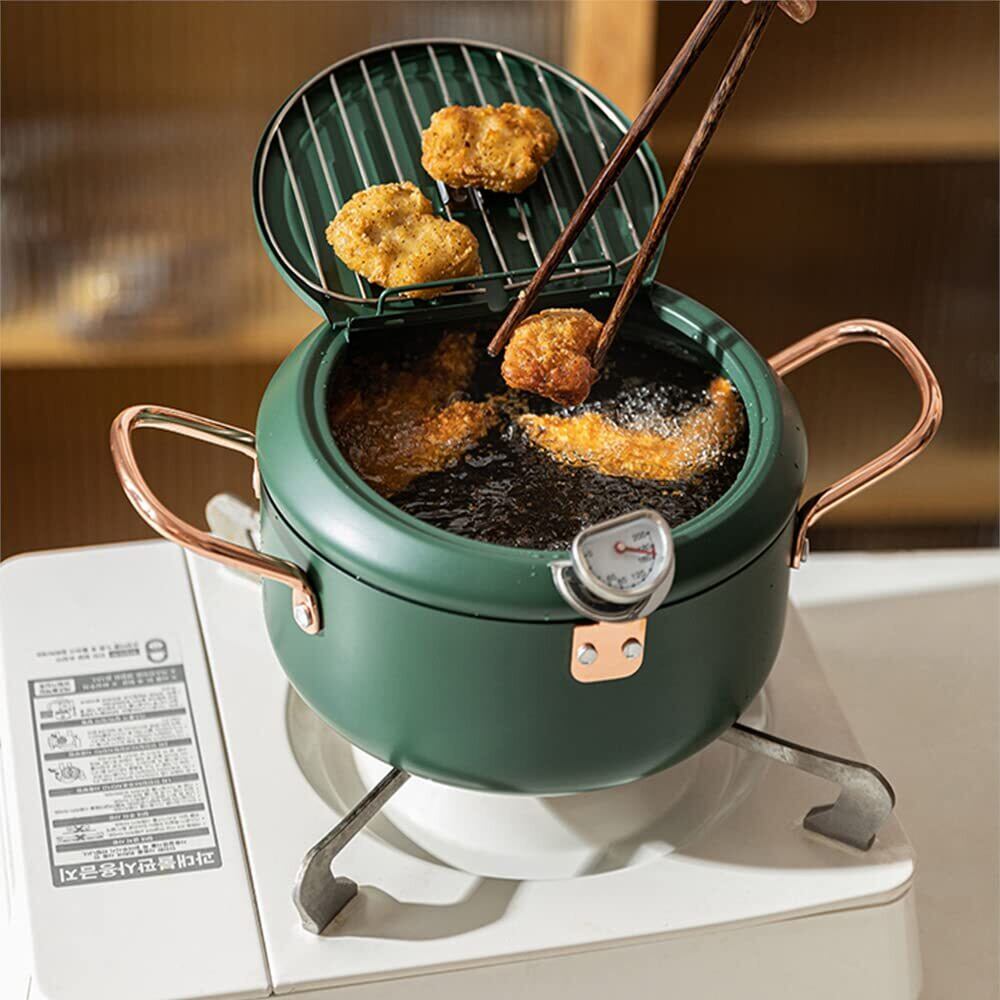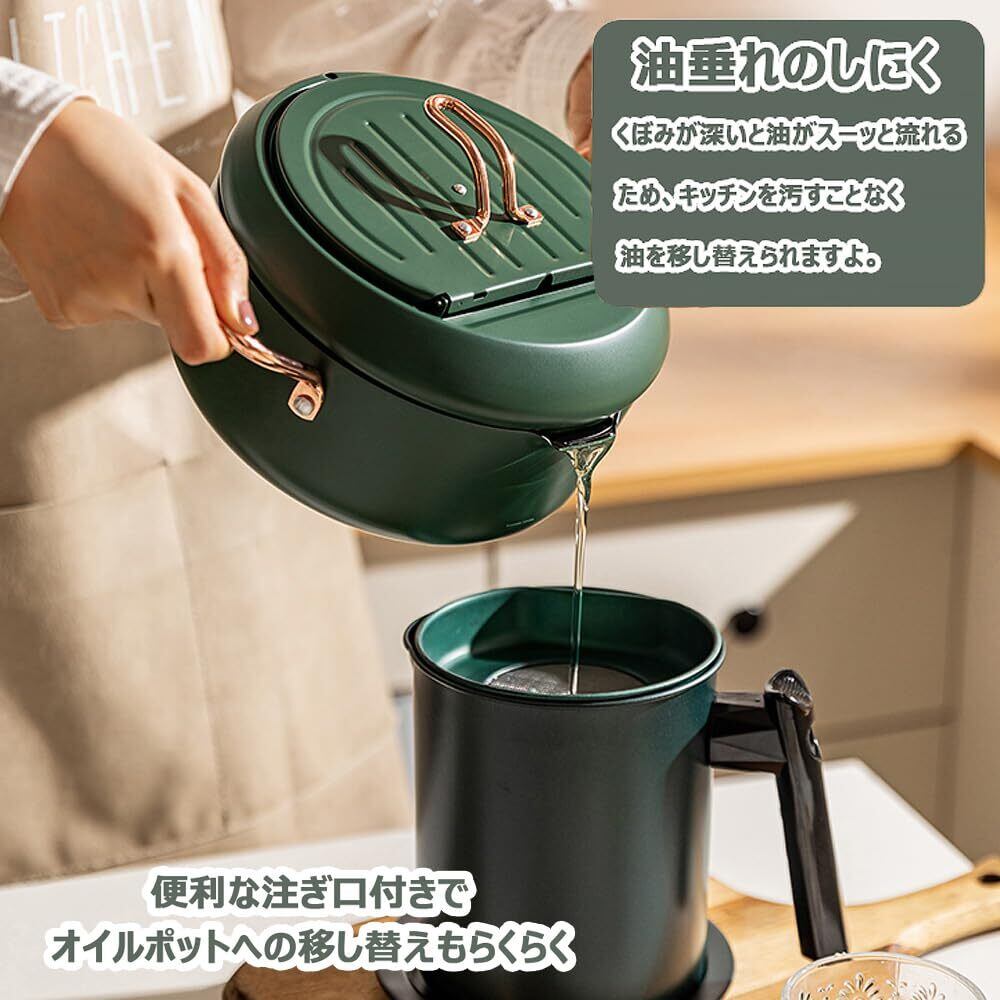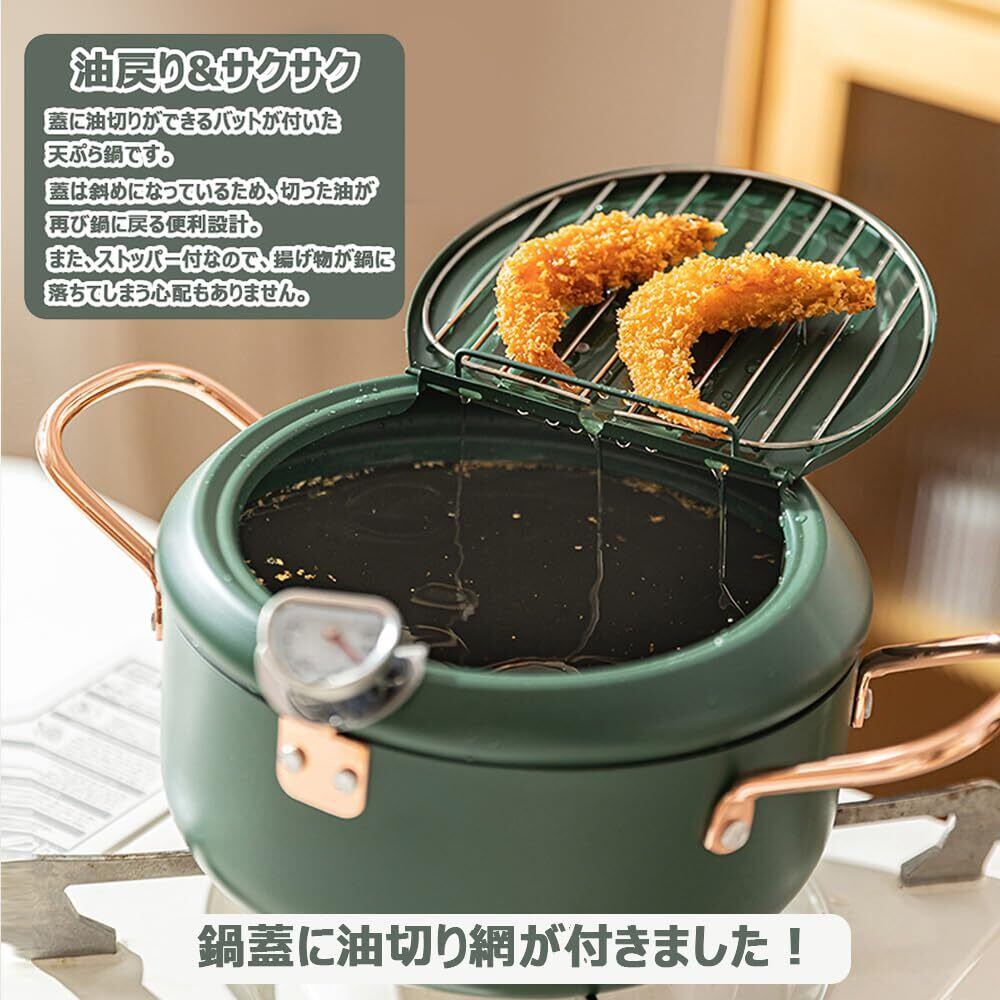 JOKINECO 天ぷら鍋 揚げ物 鍋 温度計付き フタ付き あげもの鍋 油切りラック 注ぎ口 省油 (20cm, グリーン)