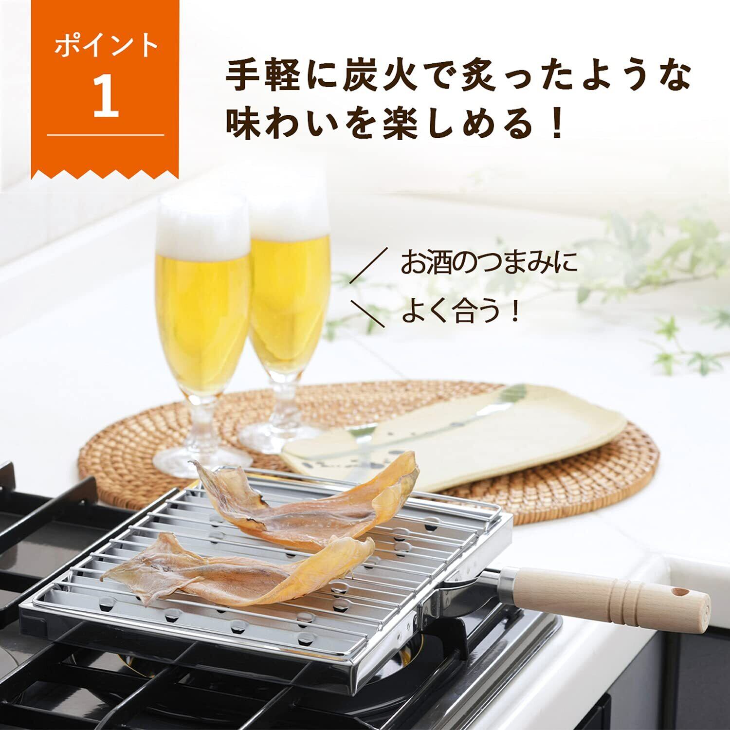 この[下村企販 あぶり焼き器]は、ガス火専用の高品質な焼き網です。遠火でじっくり焼くことで、干物や野菜、お餅、するめなど、様々な食材をふっくらと香ばしく仕上げます。ご家庭での食事が贅沢なひとときになること間違いなしです!
