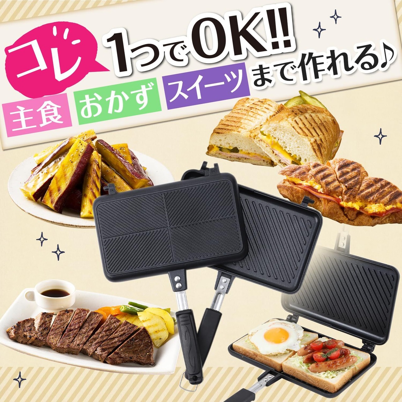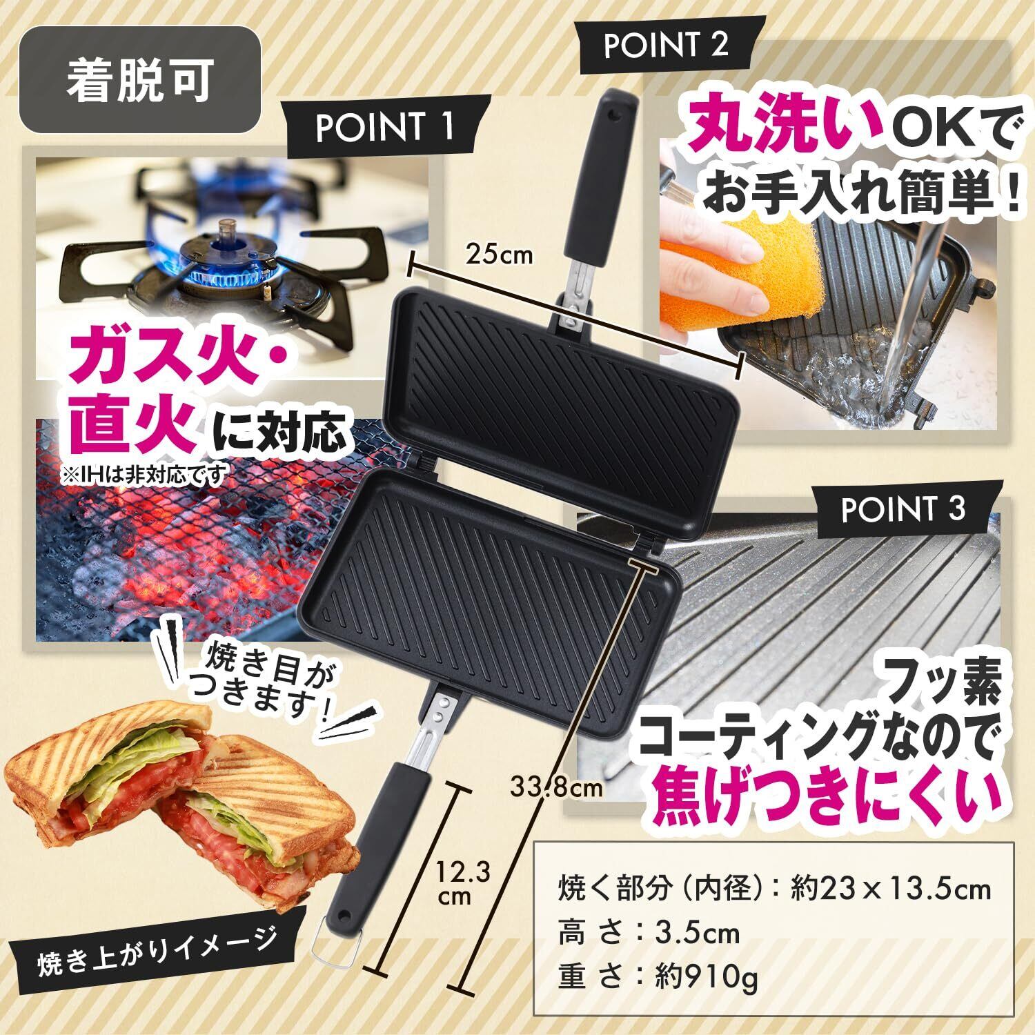 このホットサンドメーカーは分解可能で、使い終わった後のお手入れがとても簡単です。フッ素加工により、焦げ付く心配も少なく、安心して使用できます。清潔感を保ちながら、毎日の食事作りをサポートします。