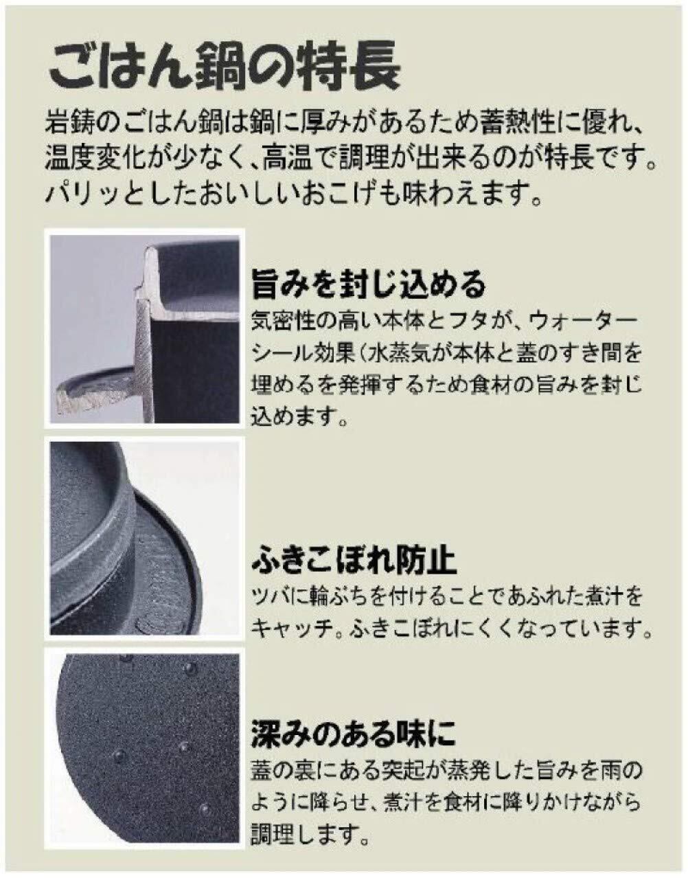 この[岩鋳 ご飯鍋]は、3合炊きのサイズで、家庭で手軽に本格的なご飯を楽しむことができます。IH調理器にも対応しているため、現代のキッチンでも安心してご使用頂けます。白飯だけでなく、炊き込みご飯やリゾットにも最適です!