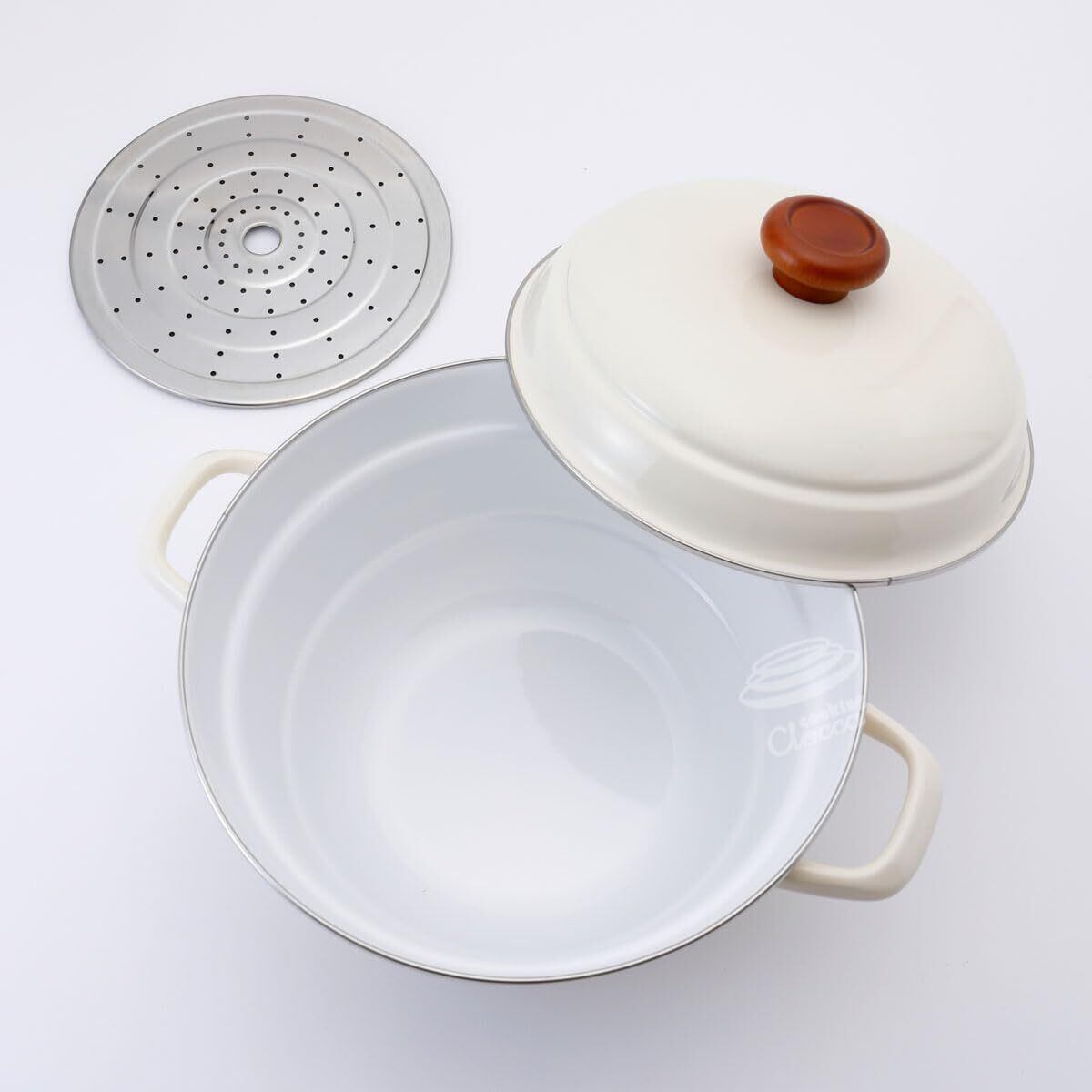 「ゆでる」「煮る」「蒸す」「揚げる」の万能ホーロー多機能鍋。〇ふきこぼれにくい形状だからパスタなどの麺がゆでやすい。 〇保温性が良く、金気がでないので煮込み料理に適しています。 〇ステンレススノコ付きで蒸し器としても。 〇揚げ物のにおいがつきにくく、内面が白いので、揚がり具合がわかりやすい。