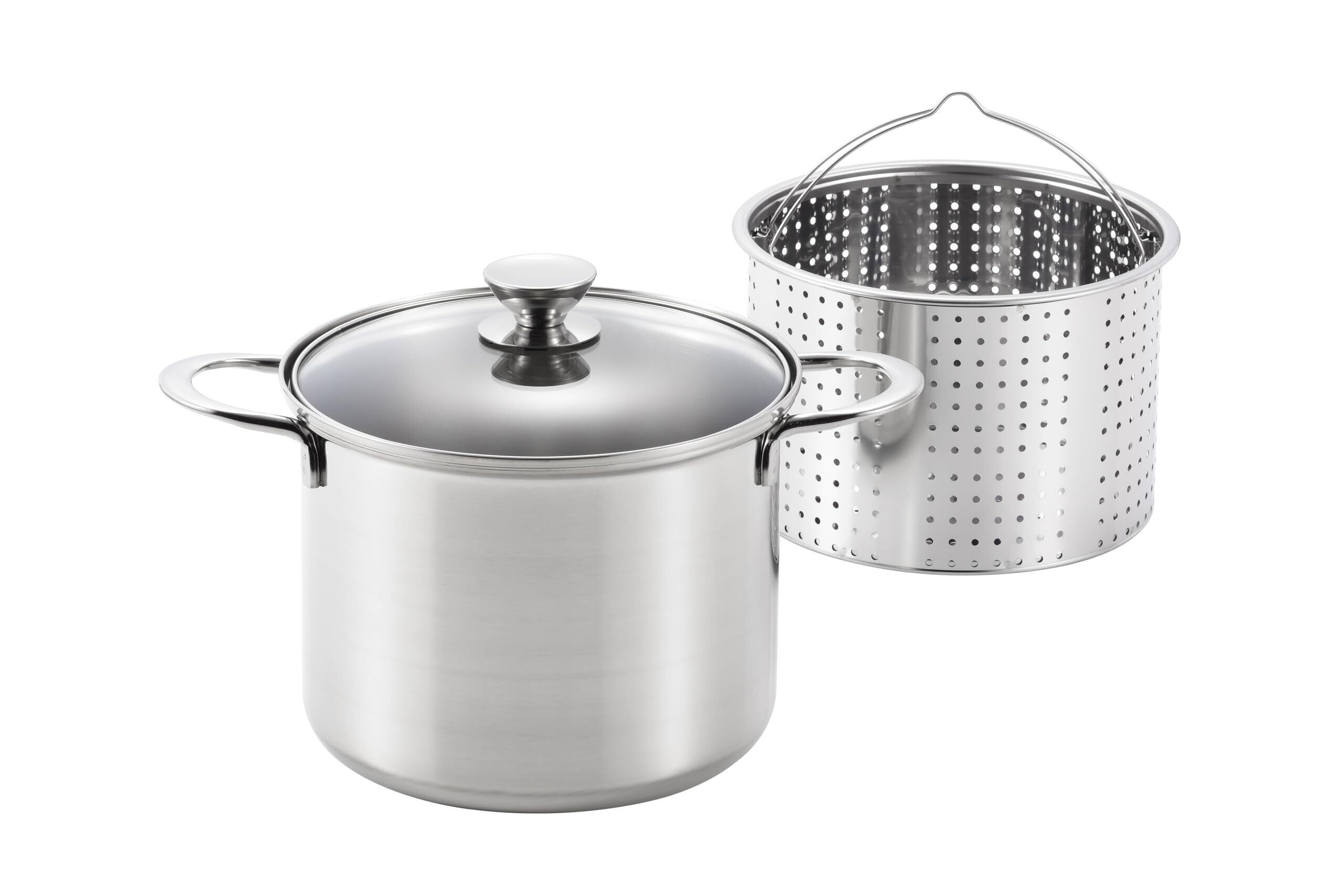 材質:本体=16-0ステンレス、ハンドル・つまみ=ステンレス、蓋=強化ガラス、カゴ=ステンレス