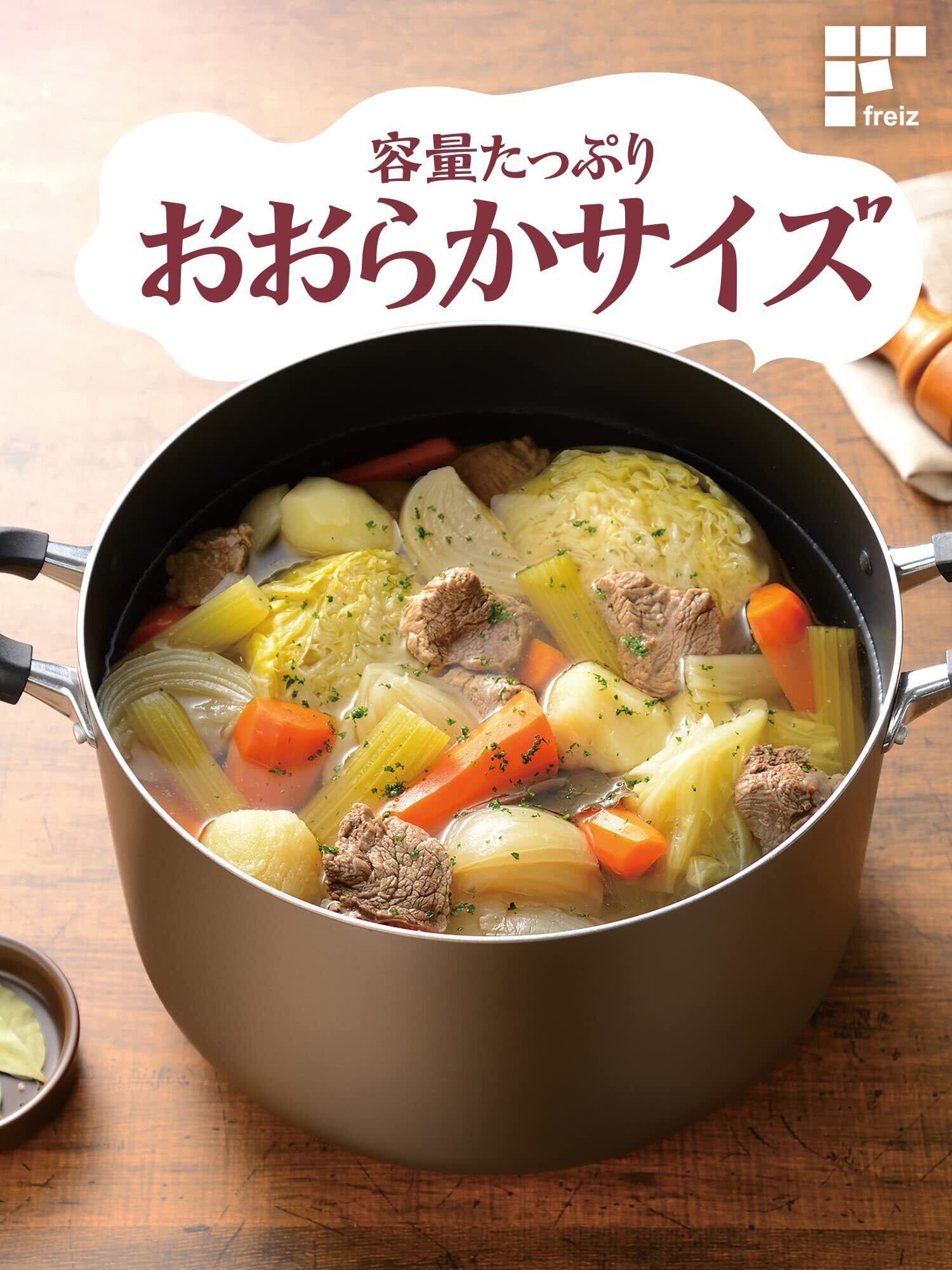 おおらか鍋としてデザインされており、料理をしながらの観察も楽しめます。しっかりとした持ち手で扱いやすく、煮崩れを防ぐ構造が施されています。毎日の調理が楽しくなる要素が詰まっています。