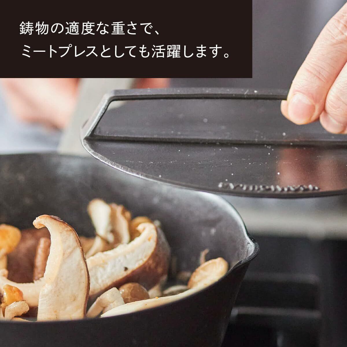 鋳物の適度な重さで、ミートプレスとしても。均一に火入れができ、香ばしくキレイな焼き目をつけることができます。