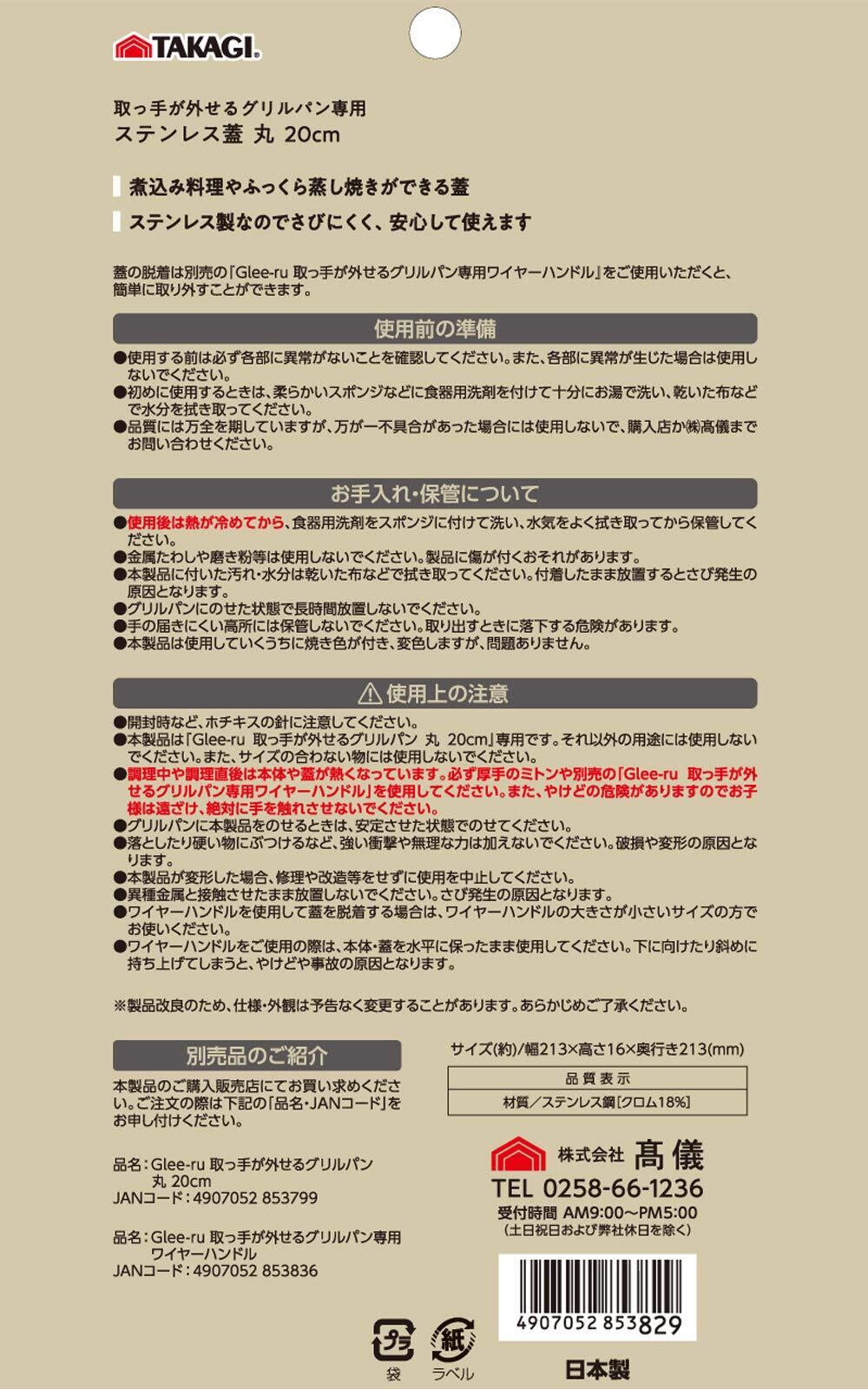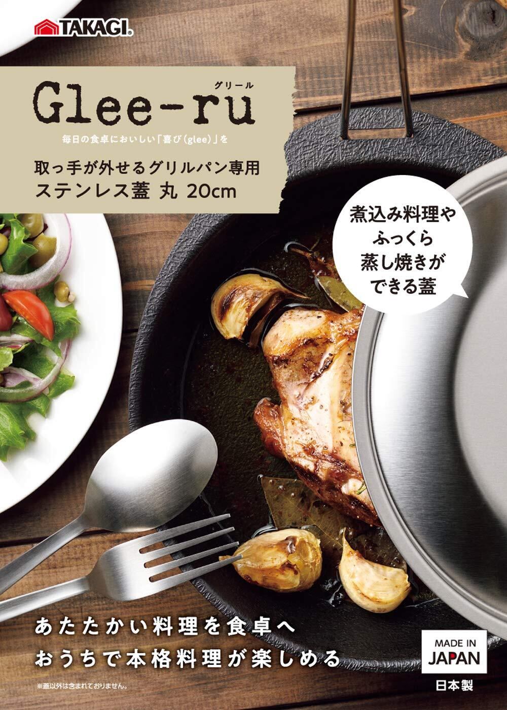 髙儀(Takagi) 日本製 取っ手が外せる グリルパン 専用 ステンレス蓋 丸型 20cm ステンレス鋼 シルバー キャンプ アウトドア 家庭用