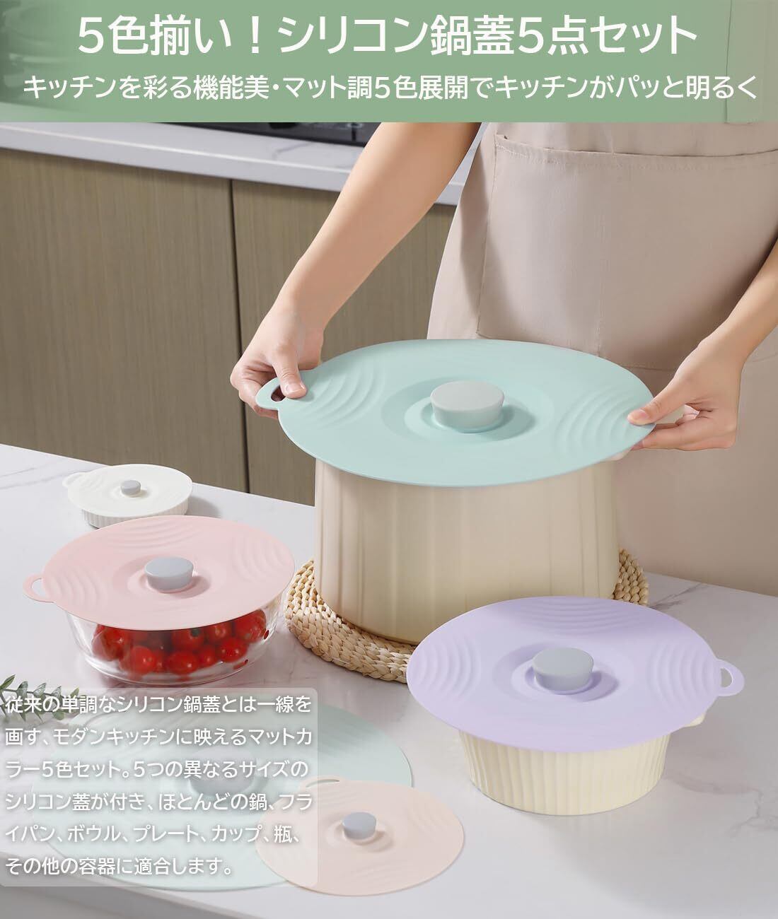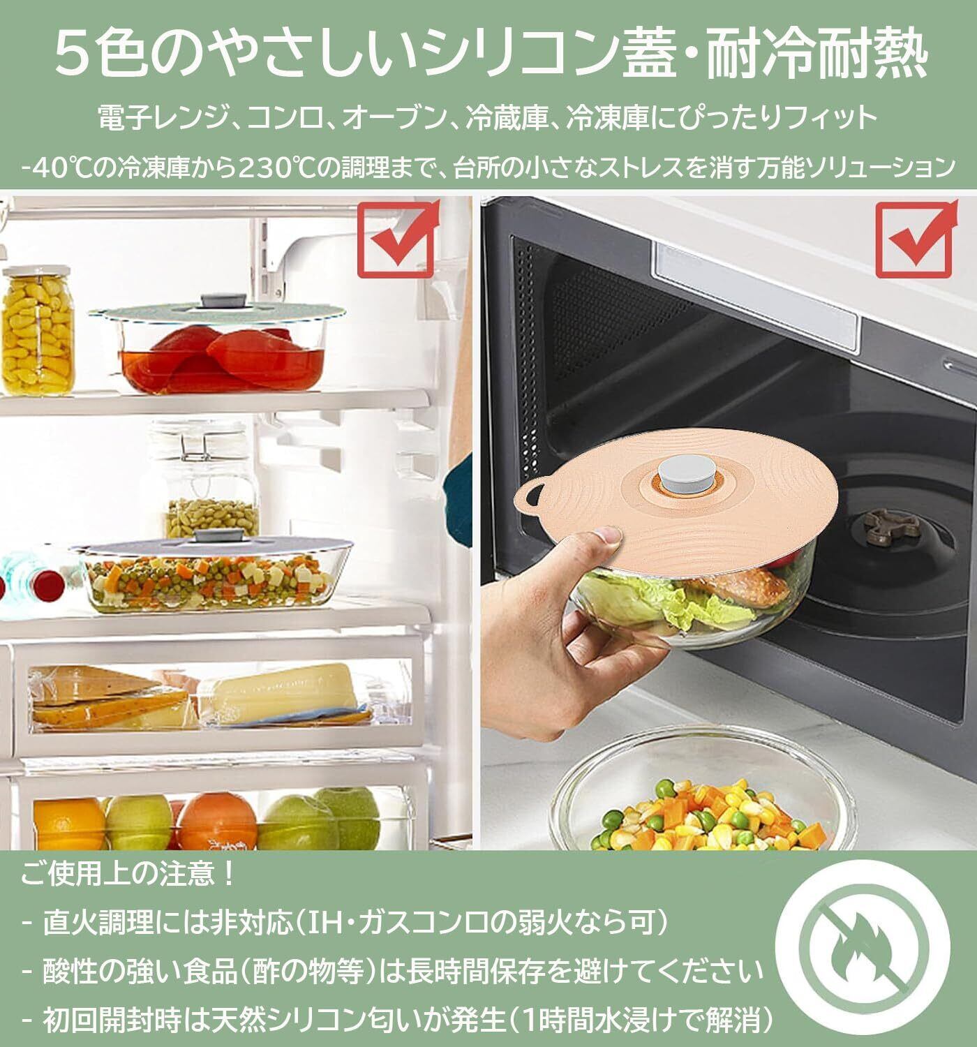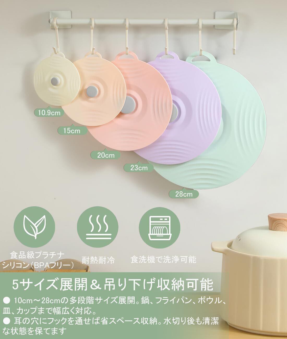 【5色サイズで99%の鍋にフィット&機能的な色分け】:ベージュ、淡いオレンジ、ピンク、ラベンダー、ミントの5色セット。無機質なキッチン空間に温もりとおしゃれなアクセントを添えます。鍋のサイズや用途ごとに色分け可能!「赤は味噌汁用」「青はパスタ用」など、家族で共有しても混乱なし。10cm~28cmの多段階サイズのシリコン蓋展開、シリコンふたは、ステンレス鋼、金属、ガラス製のほとんどの鍋、フライパン、ボウル、プレート、カップ、瓶、その他の容器に適合します。