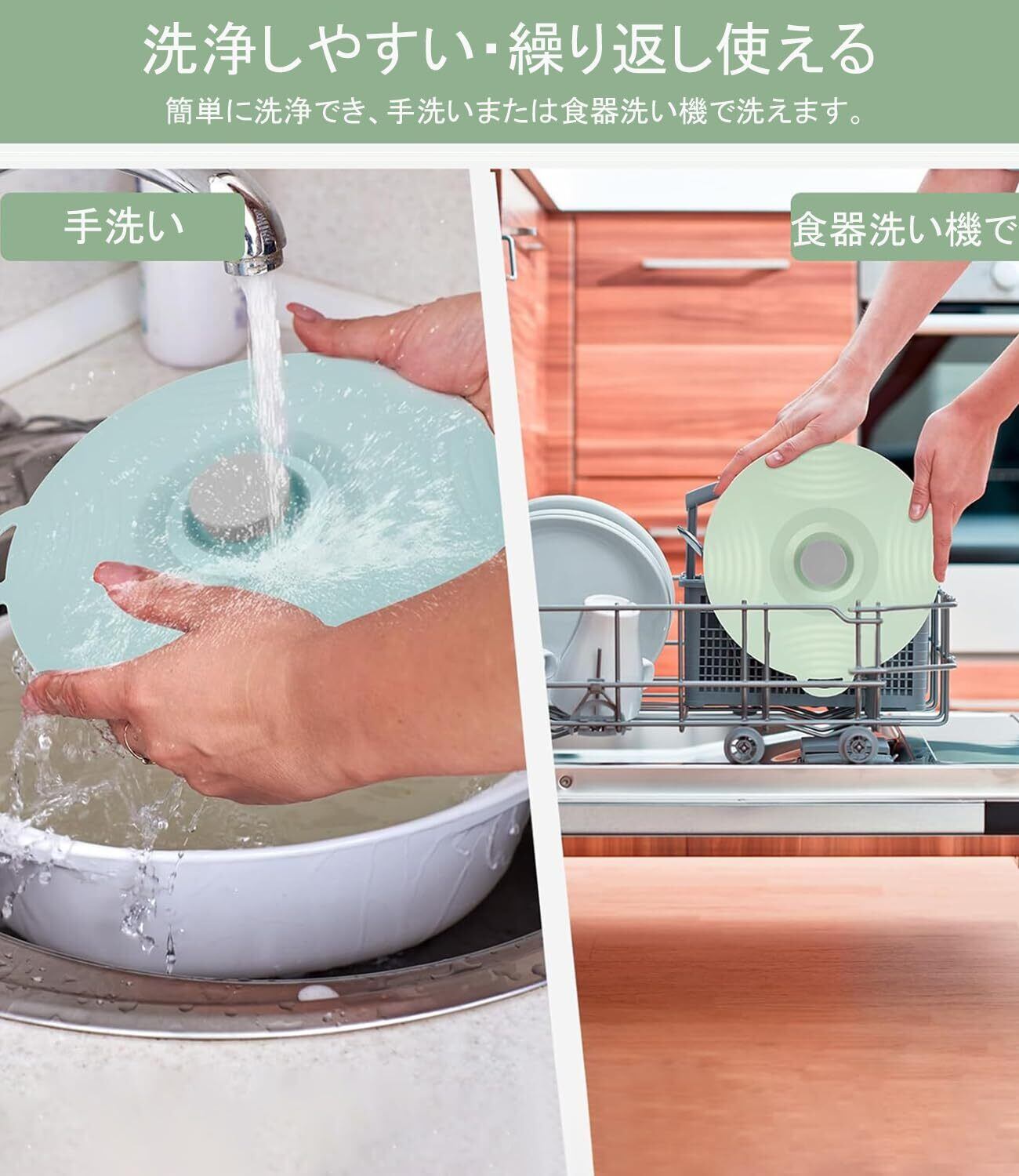 【吊り下げ収納可能&お手入れ簡単】:当社のシリコン蓋カバーは耳の穴にフックを通せば省スペース収納。水切り後も清潔な状態を保てます。使い勝手と収納のしやすさを両立。電子レンジの飛び散りカバーはお手入れが簡単です。 使用後は、中性洗剤で拭くか、食器洗い機を使用して素早くきれいにするだけで済みます。変色・変形なし