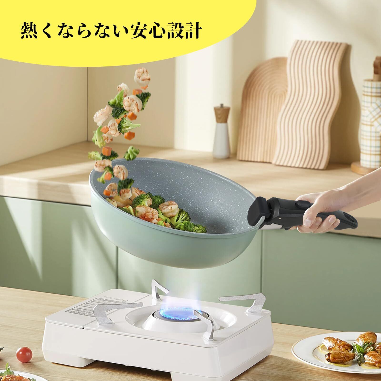 【高耐熱素材で長持ち】フライパン取っ手は食品グレードシリコン、ステンレス、フェノール樹脂を採用します。高温調理にも耐え、長期間使用可能です。汚れたら水洗いするだけの簡単お手入れ。内部の金属部品も錆にくい仕様なので、清潔さを長く保てます。