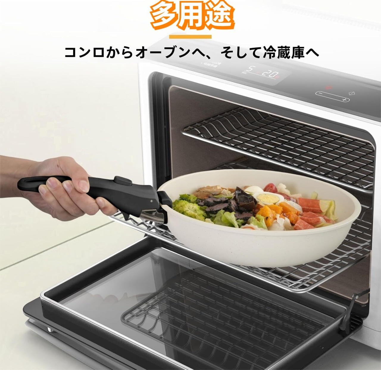 【ワンタッチ着脱で簡単操作】このフライパン用取っ手は人間工学に基づいて設計され、片手で簡単に取り付け・取り外しができるため、調理中もラクラク操作できます。