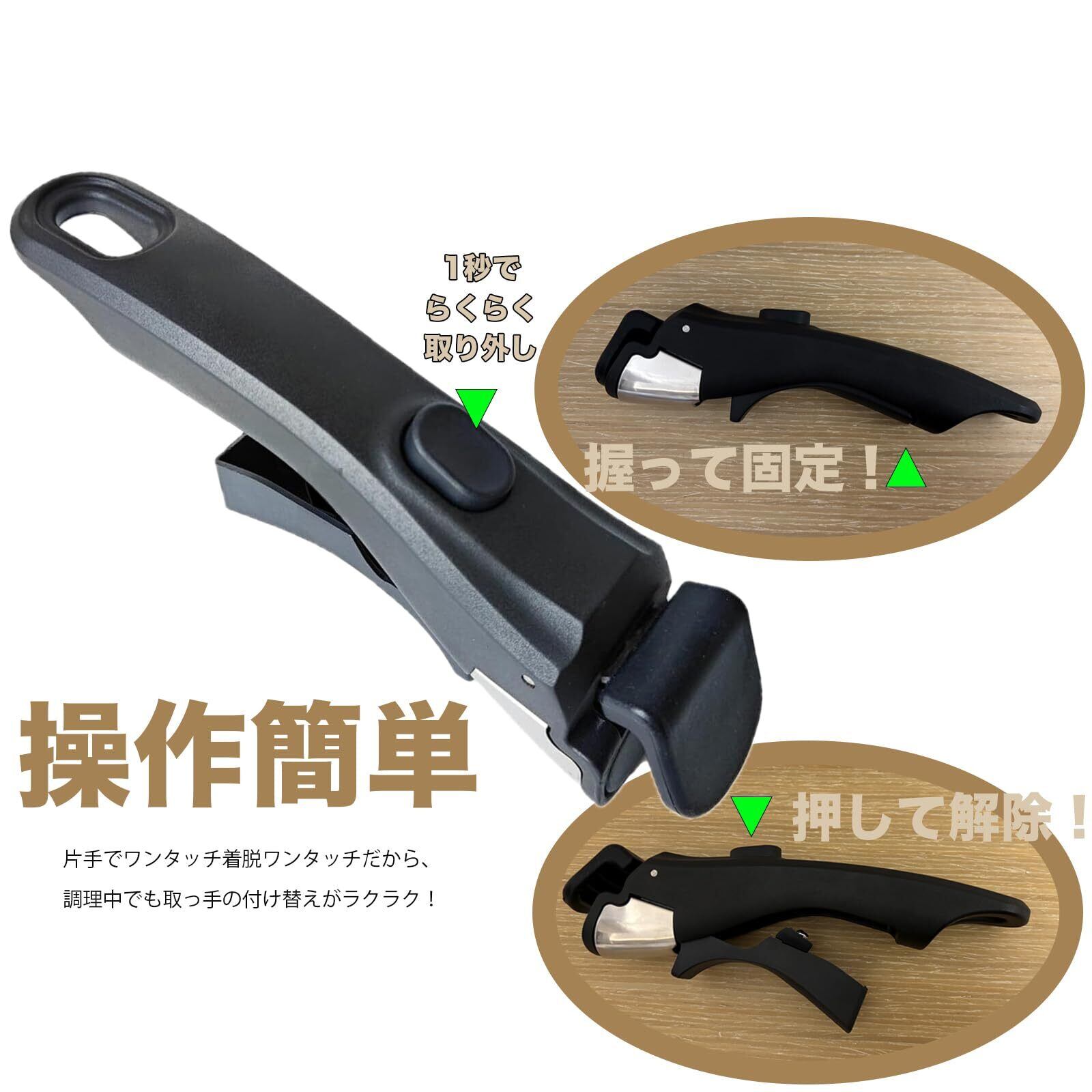 【操作簡単】取っ手の着脱が簡単で、取り付け時にしっかりとロックされるため、調理中の落下を防ぎます。片手で簡単にワンタッチ着脱で、調理中でも取っ手の付け替えがラクラクです。