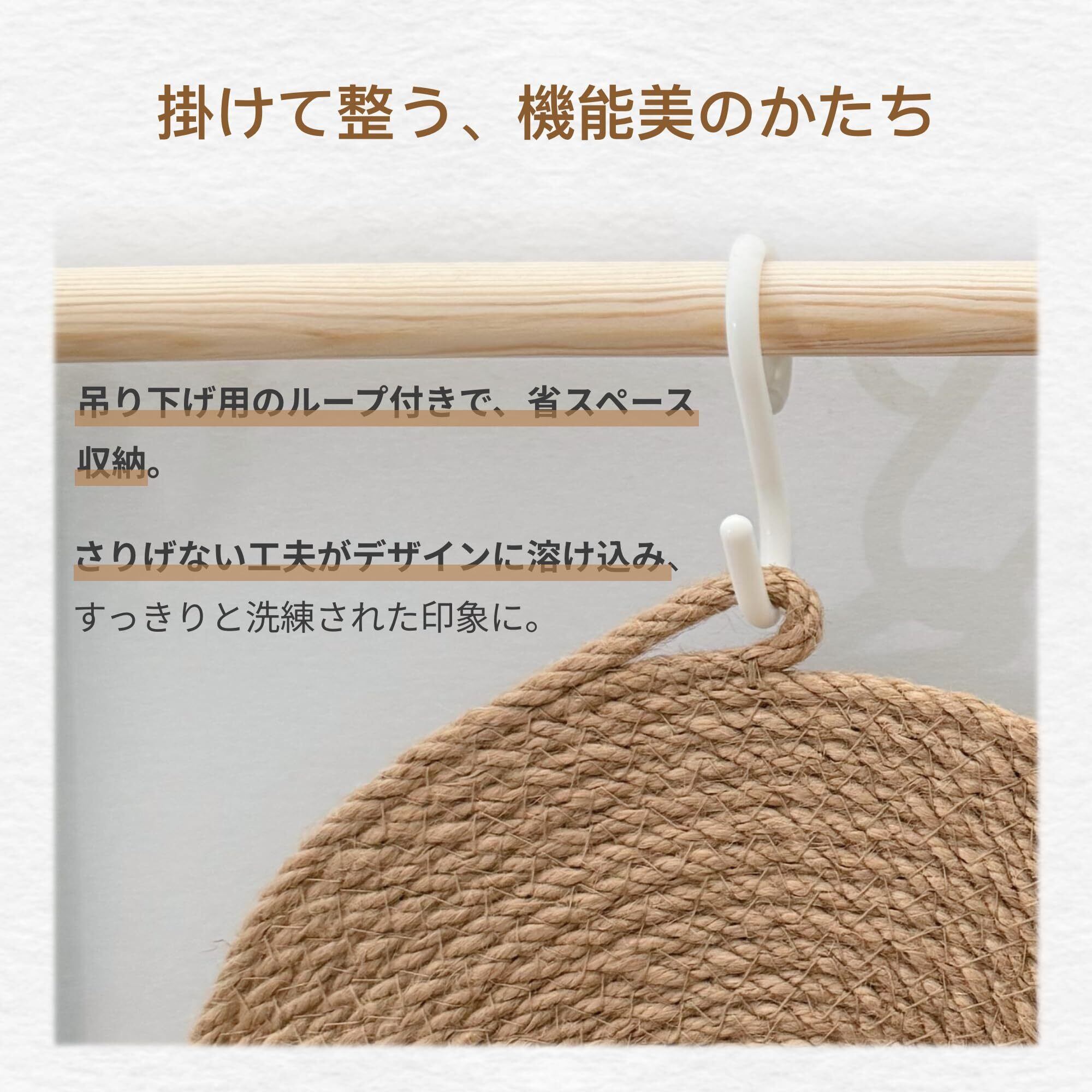 【飾れるデザイン】優しい生成り色と、手作りならではの温もりとしなやかな質感が、空間にやさしい雰囲気を添えてくれます。使っていない時も飾っておきたくなるような存在感。ナチュラル・北欧・レトロなど、さまざまなインテリアスタイルと相性抜群です。