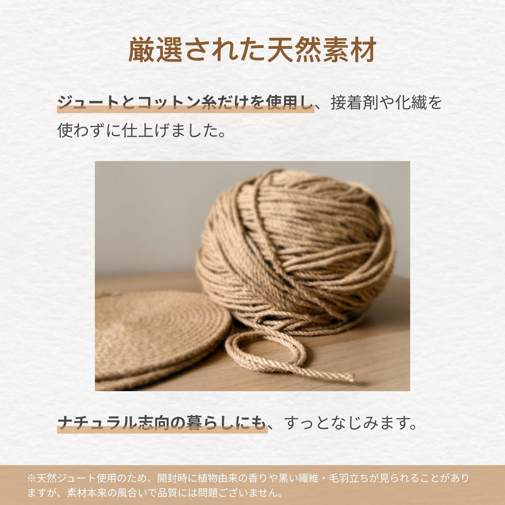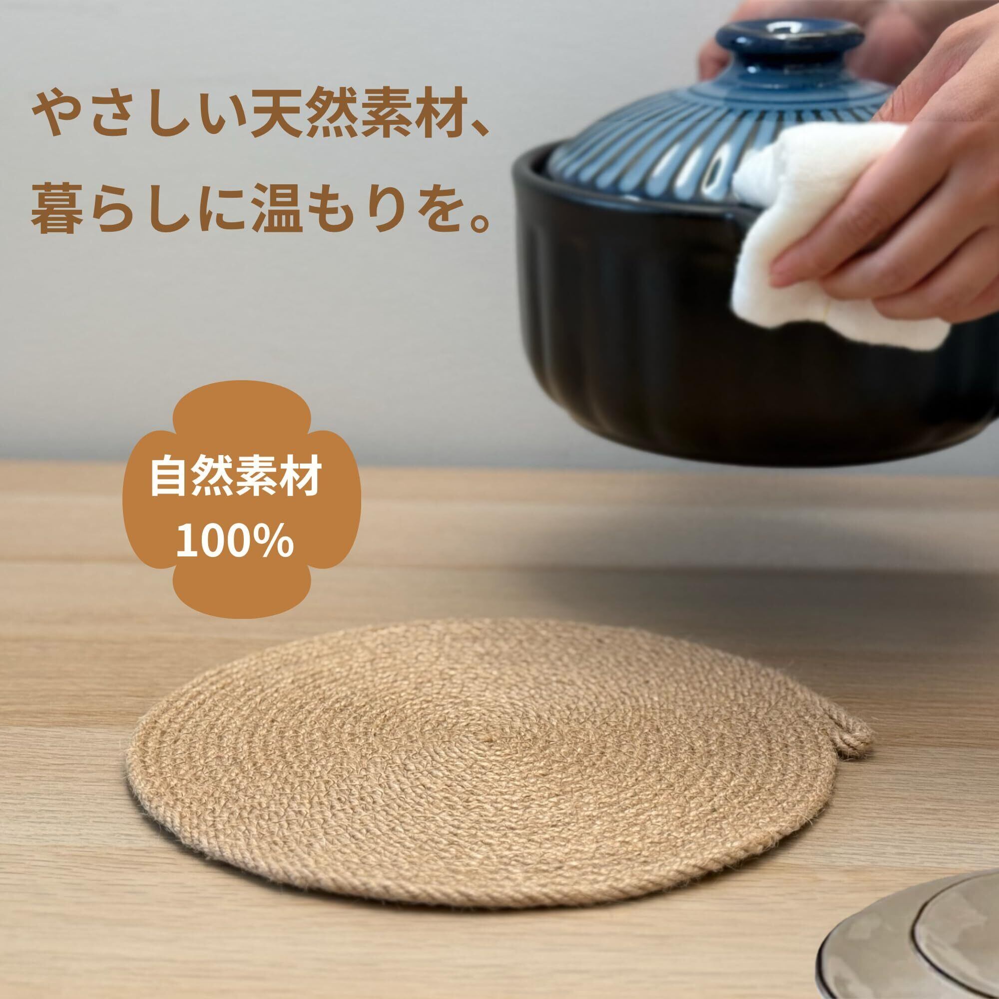 【やさしい天然素材】厳選された天然のジュート素材とコットン糸のみを使用し、接着剤や化繊を使わずに仕上げた、自然な風合いを活かした鍋敷きです。ナチュラル志向の方にも安心してお使いいただけます。