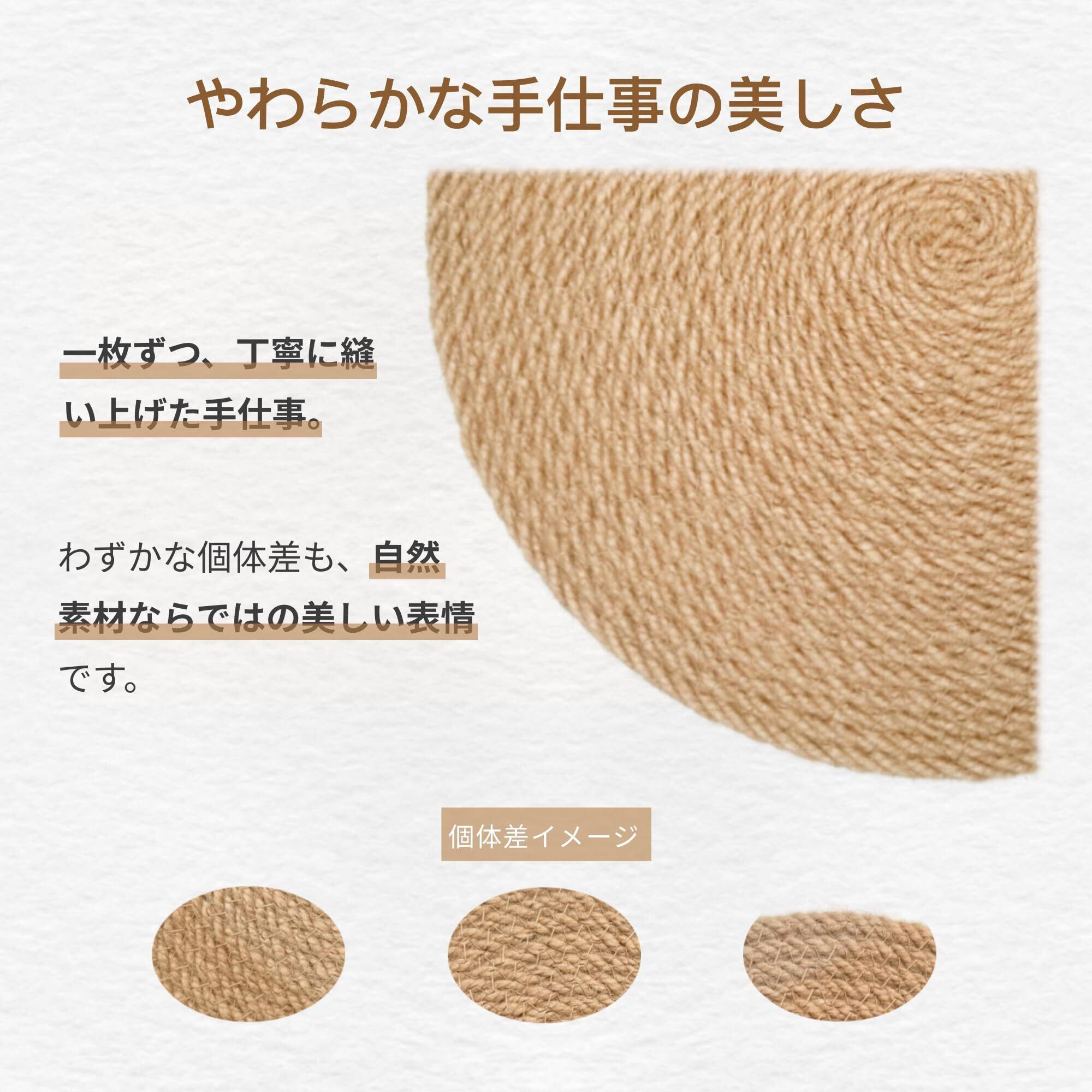 【手作りの温もり】ジュートの組み紐を丁寧に縫い上げた、手作りならではの素朴な温かみが感じられる鍋敷きです。素材の特性上、仕上がりにわずかな個体差がありますが、それもまた、柔らかな印象を持つ自然素材ならではの味わいとしてお楽しみいただけます。