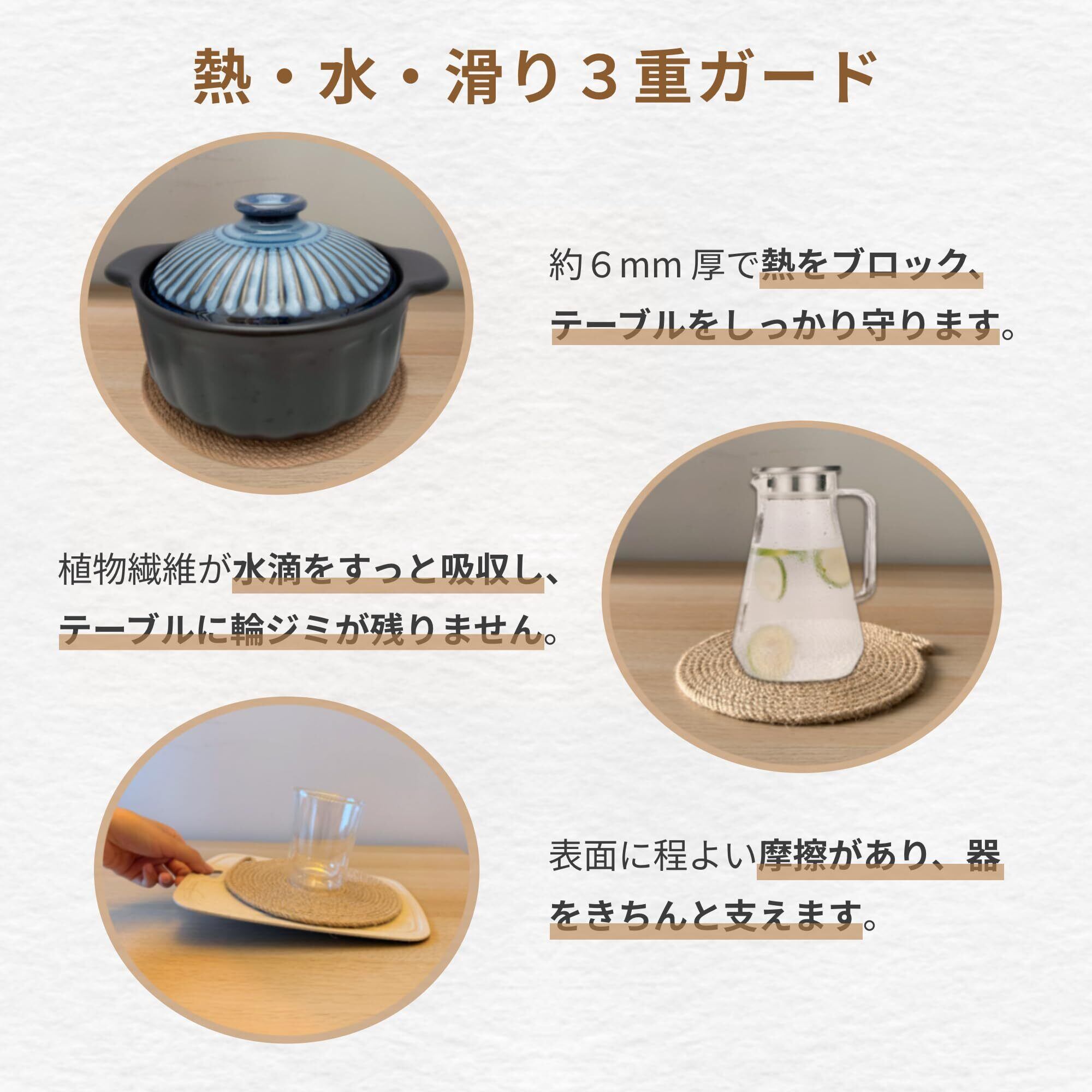【断熱・防水・滑りにくい】約6mmのしっかりとした厚みで、熱々の鍋やフライパンを置いても熱がテーブルに伝わりにくく安心です。冷たいポットやカップから出る水滴も、麻繊維が自然に吸収してくれるため水ジミになりにくく、清潔にお使いいただけます。素材表面には程よい摩擦があり、器が滑りにくく安定して置けます。丈夫で長持ちするので、毎日の食卓に頼れる一枚です。
