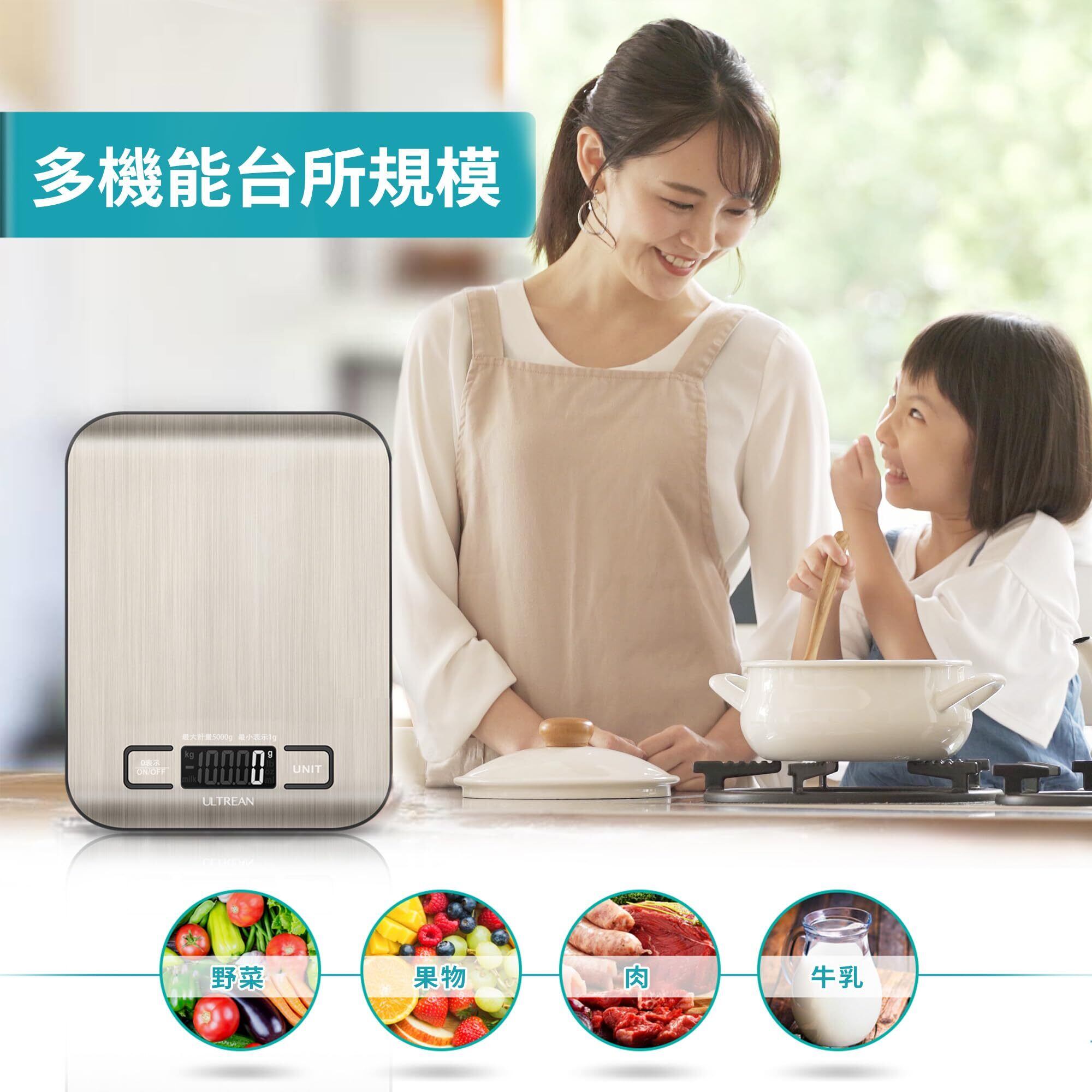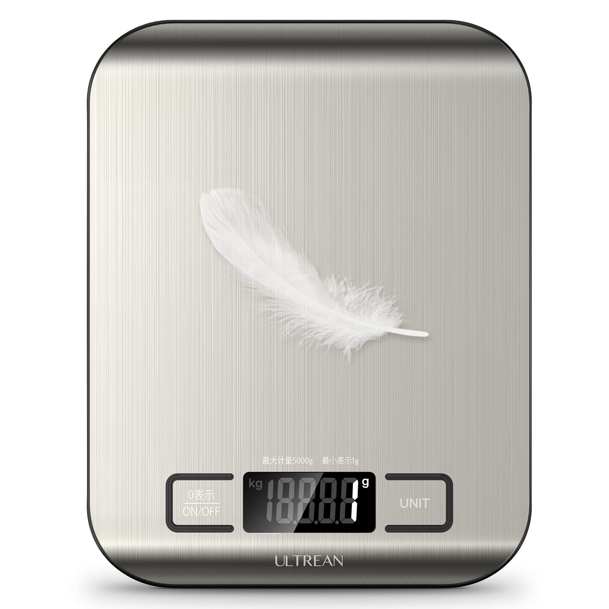 Ultrean キッチンスケール 5kg デジタル はかり 表面防水 1g単位 LCD ディスプレイ 電子 測り 計量器 料理 調理 お菓子作り 薄い 風袋引き機能(電池付属)