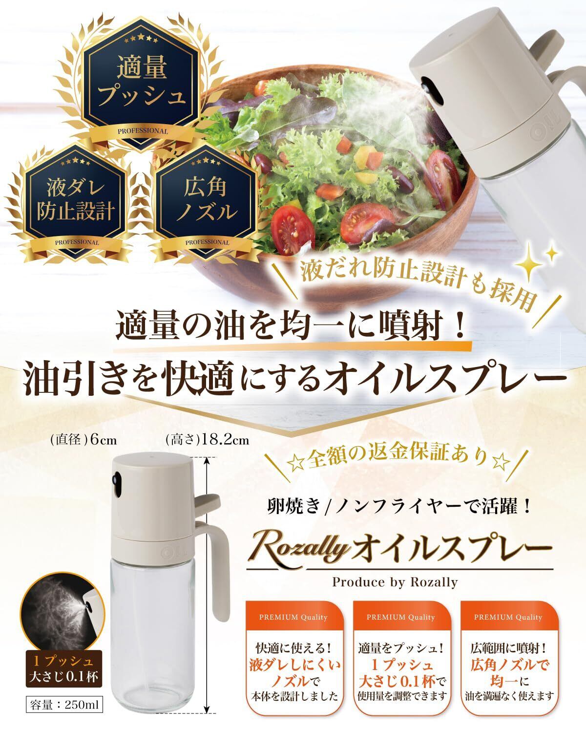 【適量のオイルを噴出】 Rozally オイルスプレー ( 油 スプレー ) がついに正式販売開始。 「適量のオイルをミスト状に霧化させて使いたい」「油引きのため均一にスプレーしたい」という お客様に人気の ガラス 素材の ボトルを採用した オイルスプレーです。 「健康のためオリーブオイル 量を減らしたい…」「ノンフライヤー料理を快適に…」 そんなお客様の声から生まれた適量でオイルを使えるボトルスプレーです。