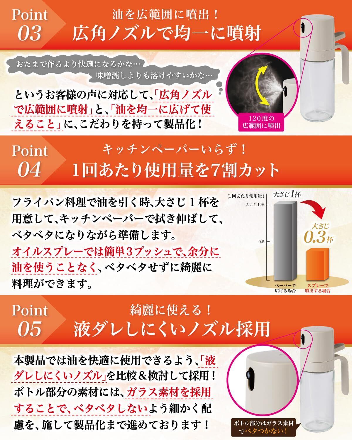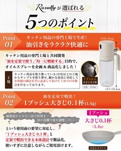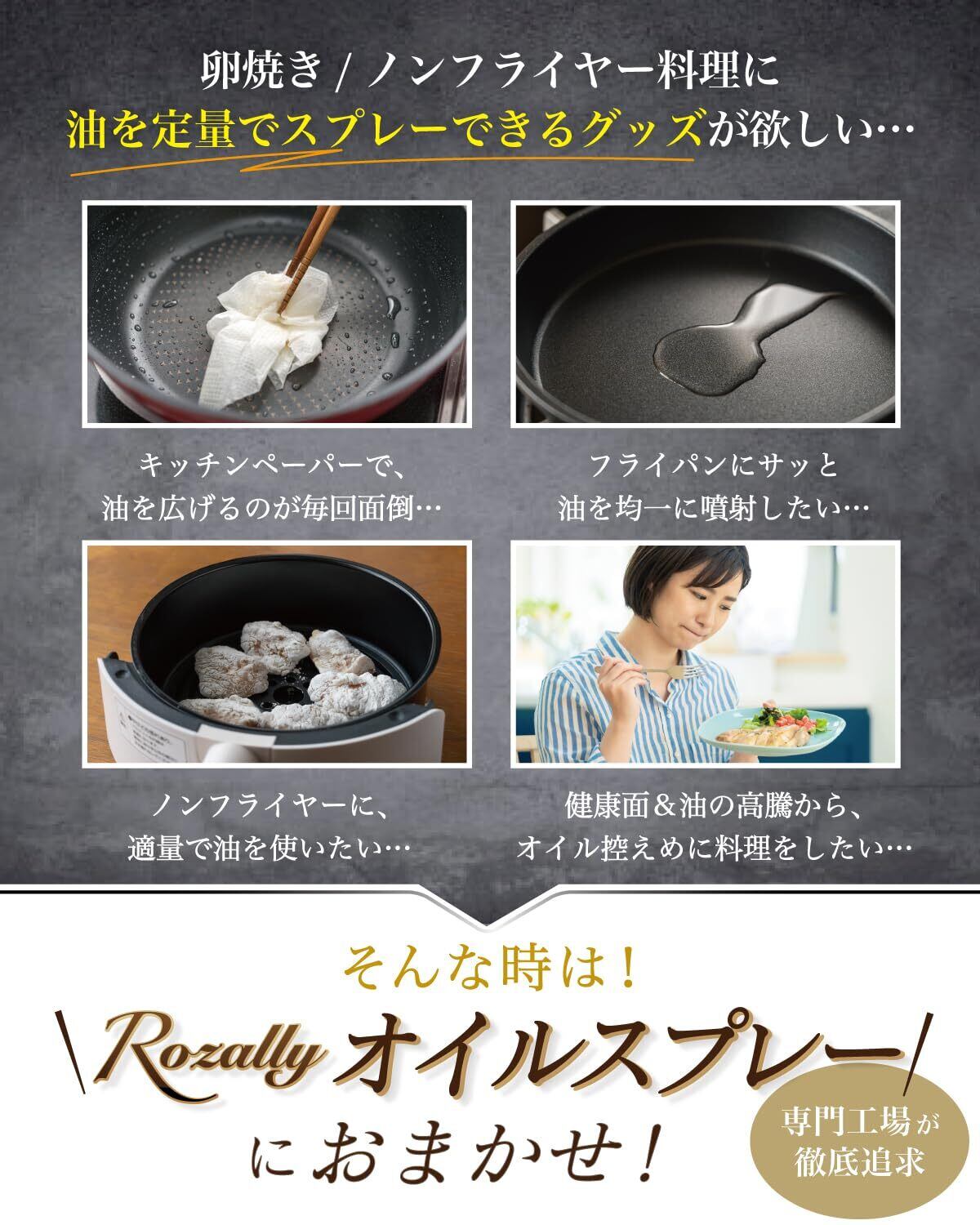 【こだわり】 様々なメーカーから キッチン 用品として ”ノンフライヤーオイルスプレー ”や” オイルスプレーボトル ”など ボトル型のオイル用品 が日本製/中国製など様々に販売されていますが、 Rozallyの オイルスプレー は”こだわり”が一味違います。 「液だれ防止の設計」で汚さずに使え、 「1プッシュ大さじ0.1杯」と定量でオリーブオイルなど使うことができます。 製菓用や料理用に大活躍すると人気のアイテムです。