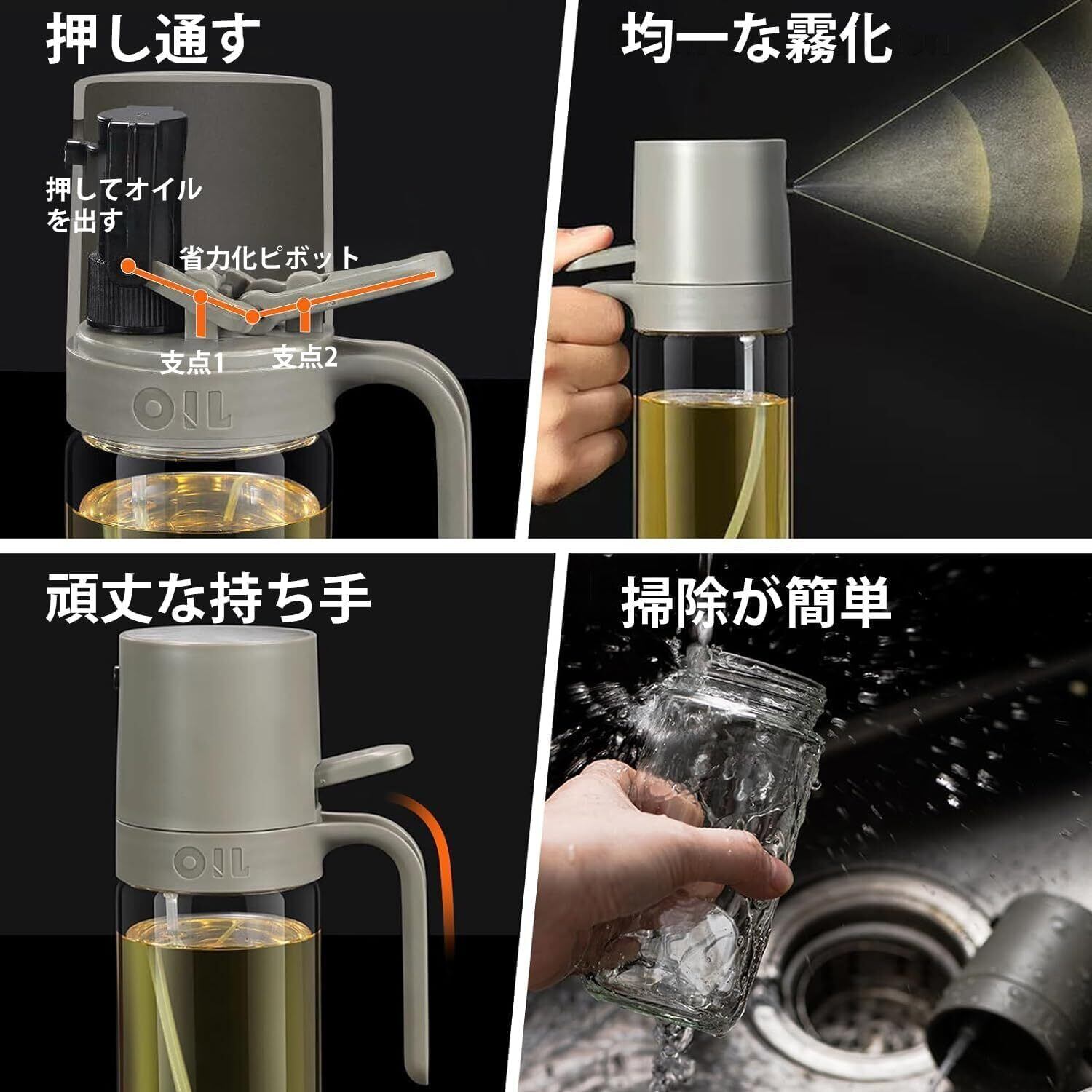 このオイルスプレーは片手で簡単に操作でき、スプレーボタンを押すだけで均一にオイルを噴射します。フィルターが付属しているため、オイルの注ぎやすさと液だれしない設計で、清潔に保つことができます。料理をするたびに手間を省き、快適に調理を楽しむことができます。