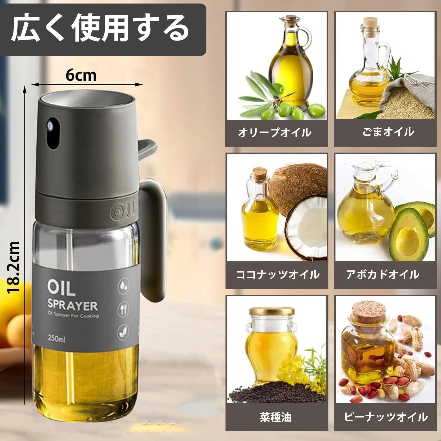 Geerow オイルスプレー 250ml 【日本JFSL370認証】オリーブオイル 耐熱ガラス オイルボトル オイル噴射管付属フィルター 調味料入れ 霧吹き スプレー オイルポット防水 片手でも使用可能 液だれしない 垂れない 食用油 グレープシード 料理用しょうゆ オイルスプレー各種調味料 (グレー)