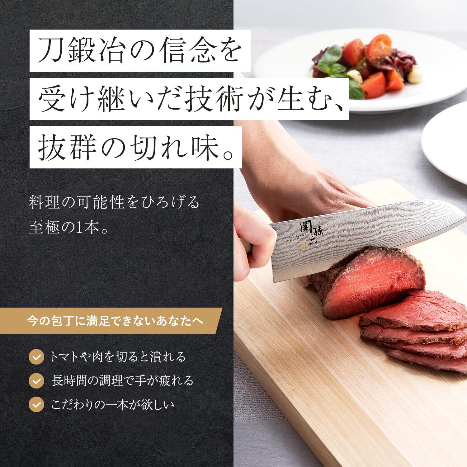 この【貝印 三徳包丁 関孫六 ダマスカス】は、165mmの刃渡りで、肉、魚、野菜と幅広い食材の調理に対応できます。ダマスカス鋼の美しい波模様は、鋭い刃と優れた切れ味を兼ね備え、プロの料理人やホームシェフにとって必携の一品です。料理のクオリティが確実に向上することでしょう!