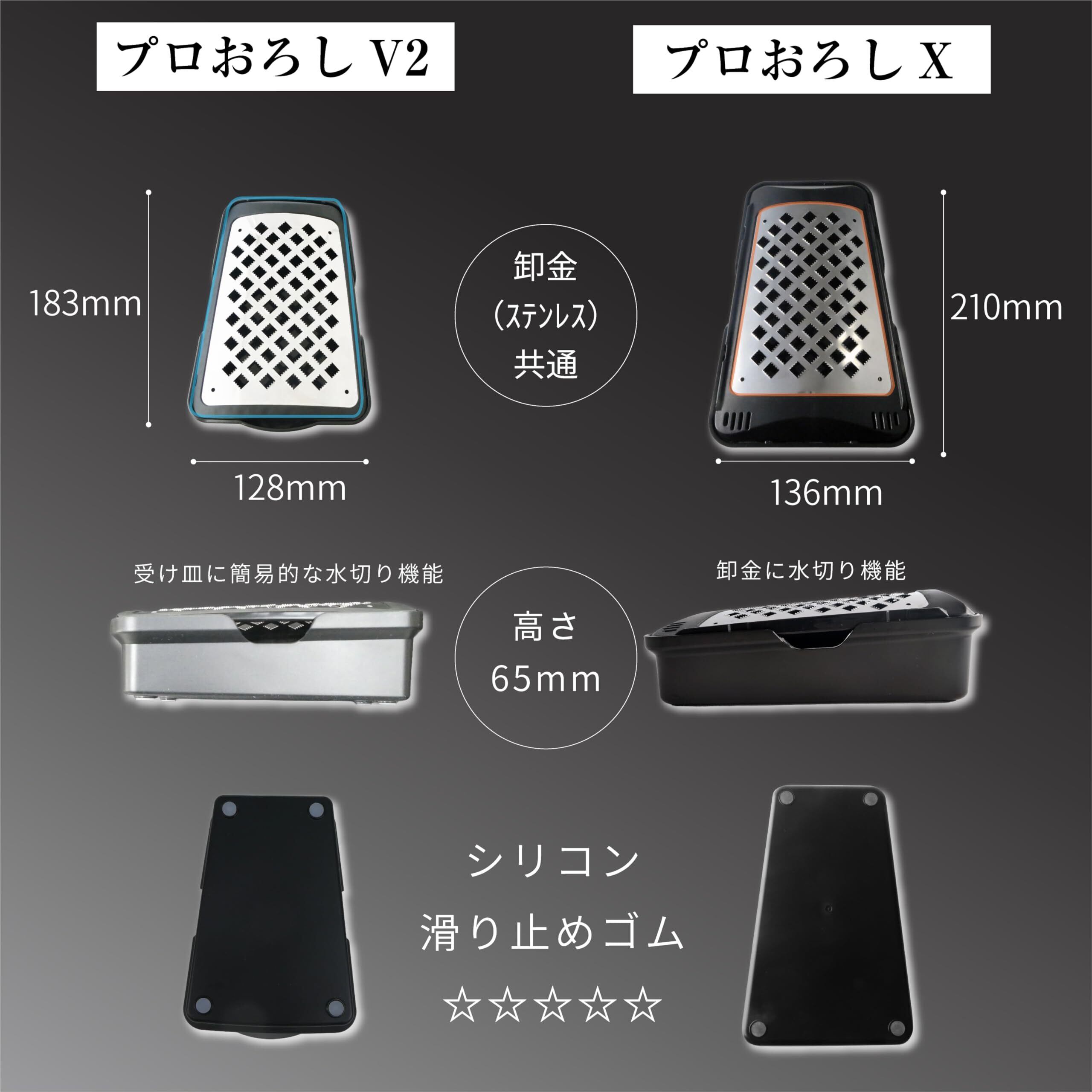 商品サイズ サイズ 210x136x65mm おろし金はプロおろしV2と同じものを使用。外枠の形状が違います。プロロおろしXはおろし金に「水切り穴」がついてます