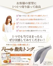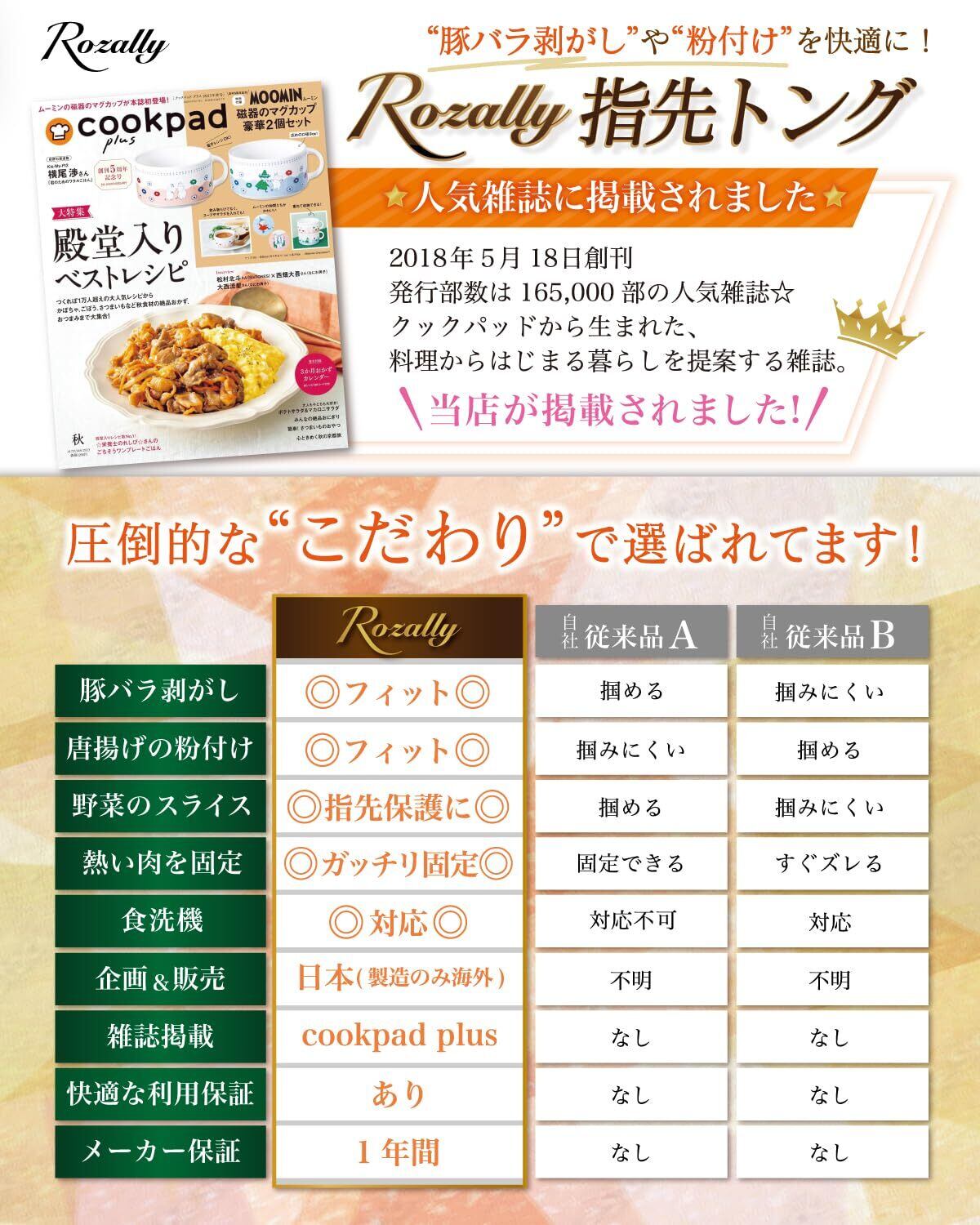 【こだわり】 様々なメーカーから キッチン 用品として ” 取り分けトング ”や” 盛り付けトング ”などステンレス製トング が日本製/中国製など様々に販売されていますが、 Rozallyの ゆび先トング は”こだわり”が一味違います。 小型サイズの設計で指先のようにフィットして使え、 手を汚すことなく料理を行うことができます。 また指先トング本体は食洗機対応なので、”水洗い”もラクラクです。