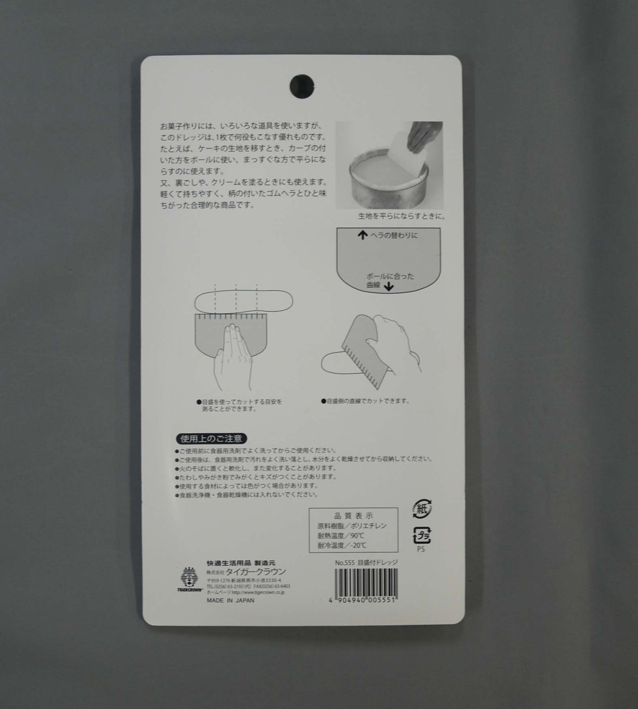 タイガークラウン スパテラ・スケッパー 白 145×3×97mm 目盛付ドレッジ ポリエチレン 生地 流し込む ならす 裏ごし 555
