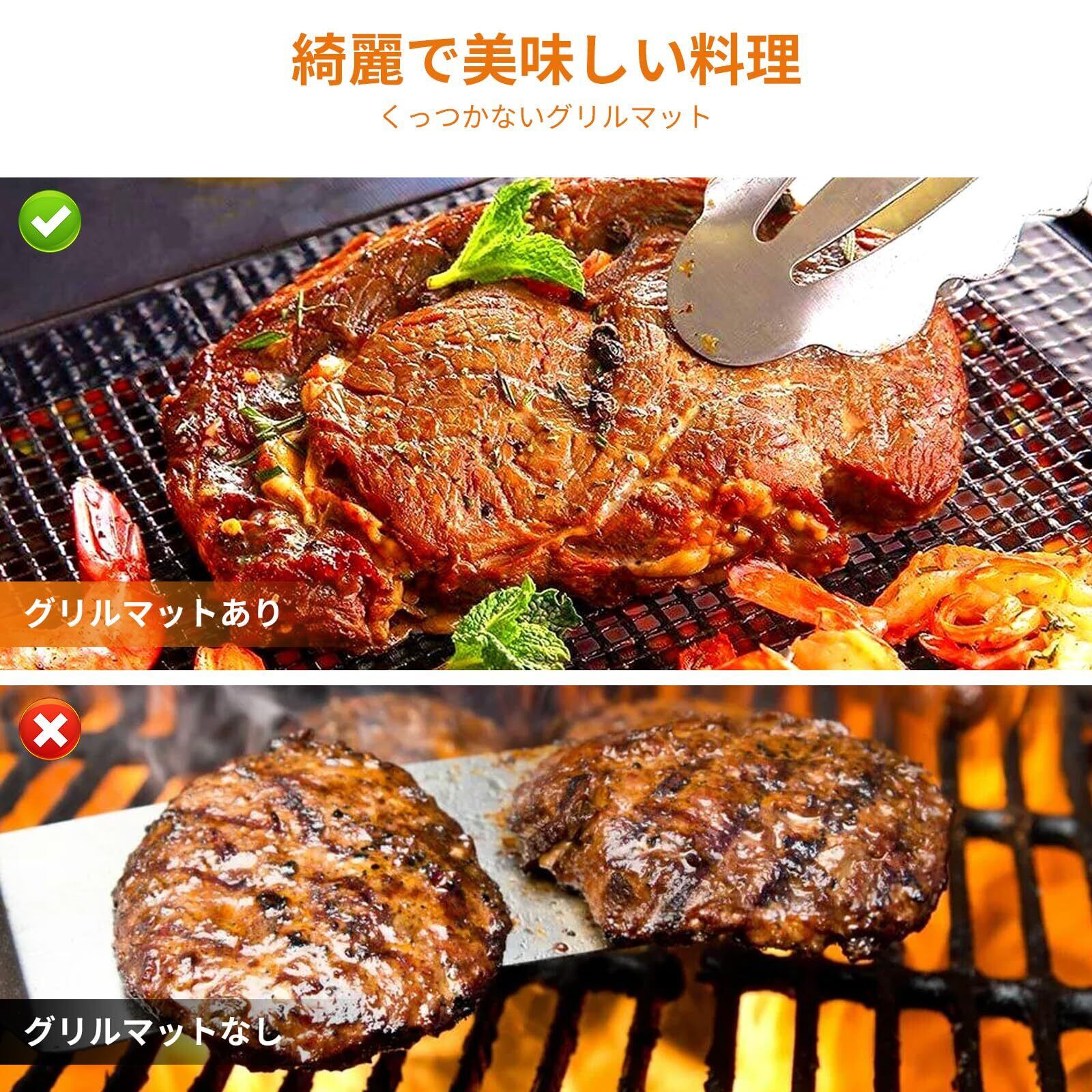 幅広い用途:ステーキ、ハンバーガー、卵、ベーコン、野菜、魚、エビ、ピザ、パンケーキなど、さまざまな食材に適しており、食材の柔らかさやジューシーさをそのままキープします。家庭のキッチンや電気オーブンはもちろん、屋外でのピクニックやパーティーでのバーベキューなど、どんなシーンでもこのグリルグリッドマットが活躍します。