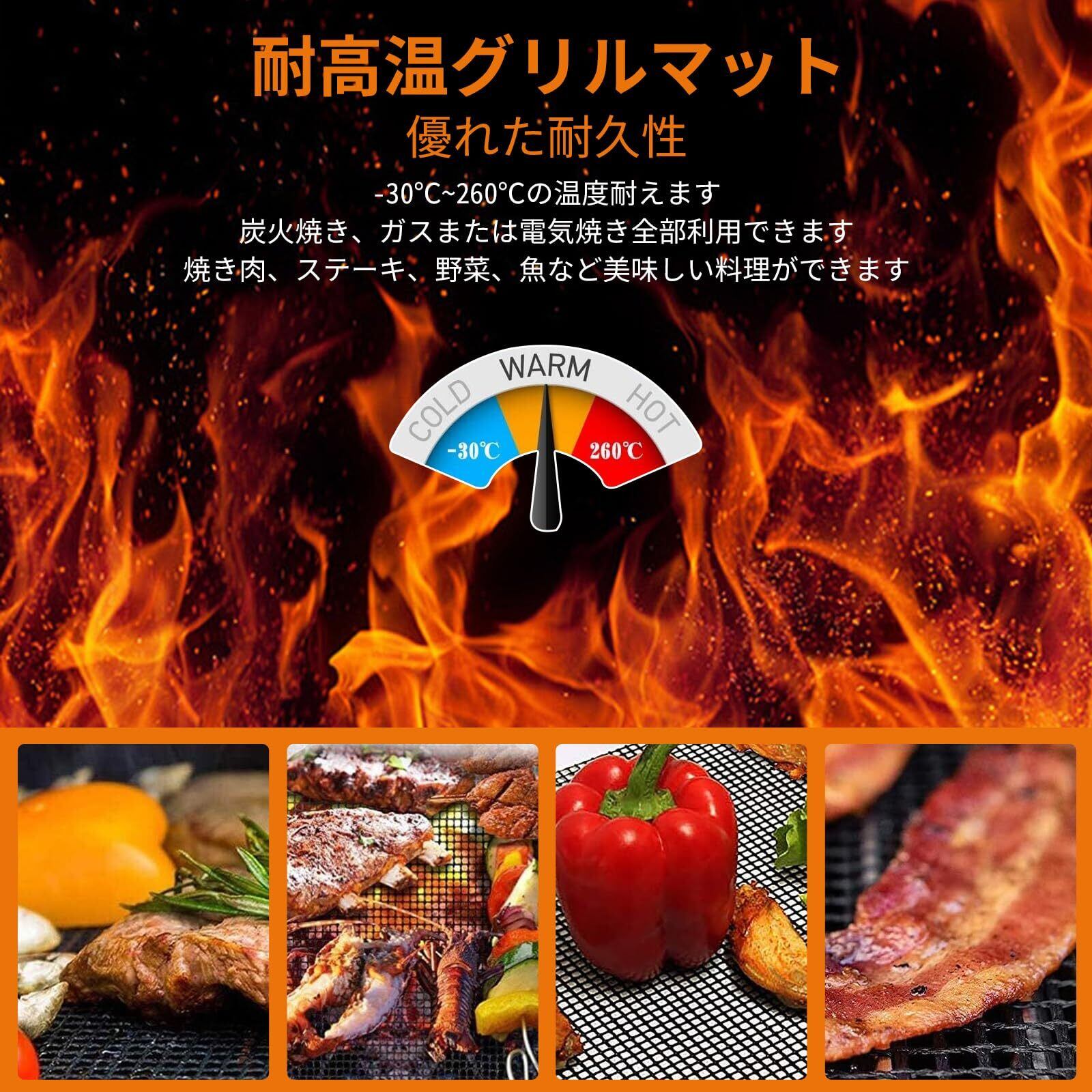 耐熱性に優れたバーベキューグリルマット: このバーベキューグリルマットは-30℃ ~ 250℃ の広範囲な温度に耐え、さまざまなグリルやベーキング環境でお使いいただけます。どんな温度条件でも、安心して使用できます。 ご注意: BBQマットの寿命を長く保ち、優れた仕上がりを維持するために、マットを直接火にさらさないようにしてください。直火にあたることを避けることで、より長くお使いいただけます。
