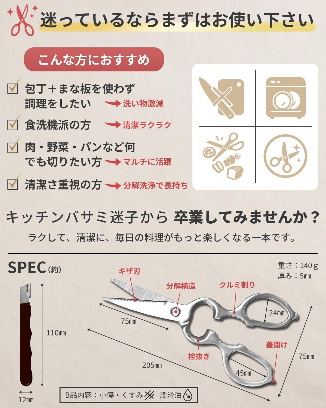 【錆びにくいステンレス製&食洗機対応】錆びにくい耐久性抜群のステンレス素材を採用。キッチンバサミ本体は食洗機対応で、油汚れやニオイも簡単に落とせて衛生的。分解できる設計で、刃の細部まで清潔に保てます。