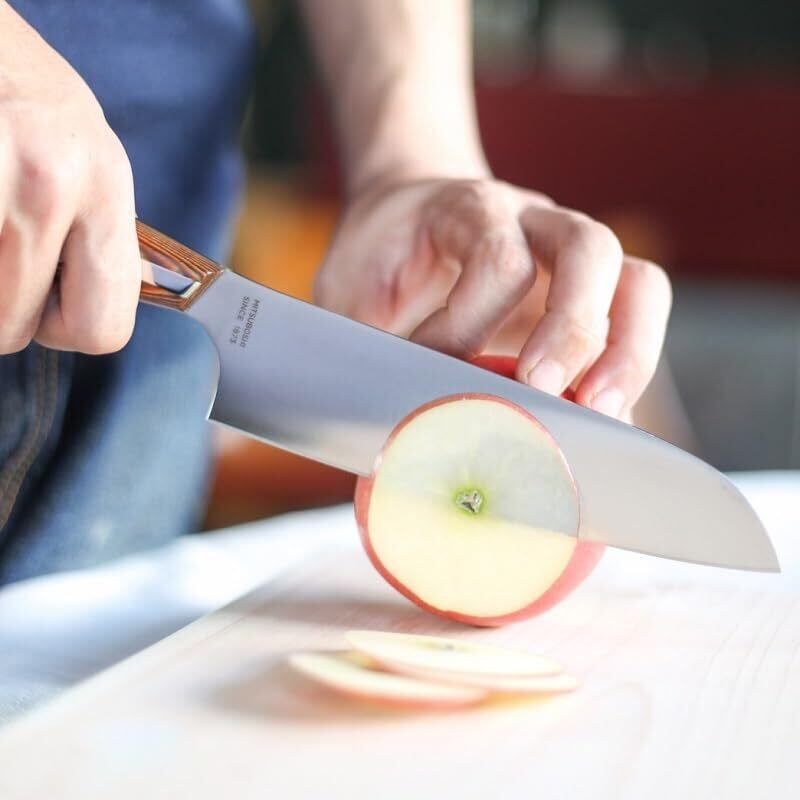【商品情報】三徳は読んで字のごとく、“肉”、“魚”、“野菜”を切れることが由来の日本の万能包丁。「和 NAGOMI」の三徳包丁は切れ味が鋭く、ハンドルに段差がないので手とひとつになる様なグリップ感。一つひとつが職人の手作業によるものです。長時間の使用でも疲れにくく、美しいデザインは毎日のお料理をより楽しくしてくれます。