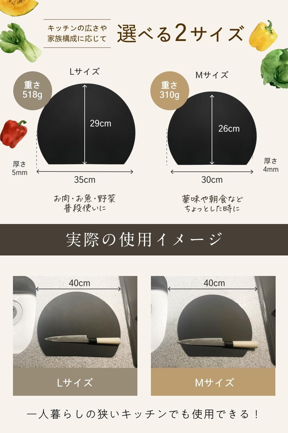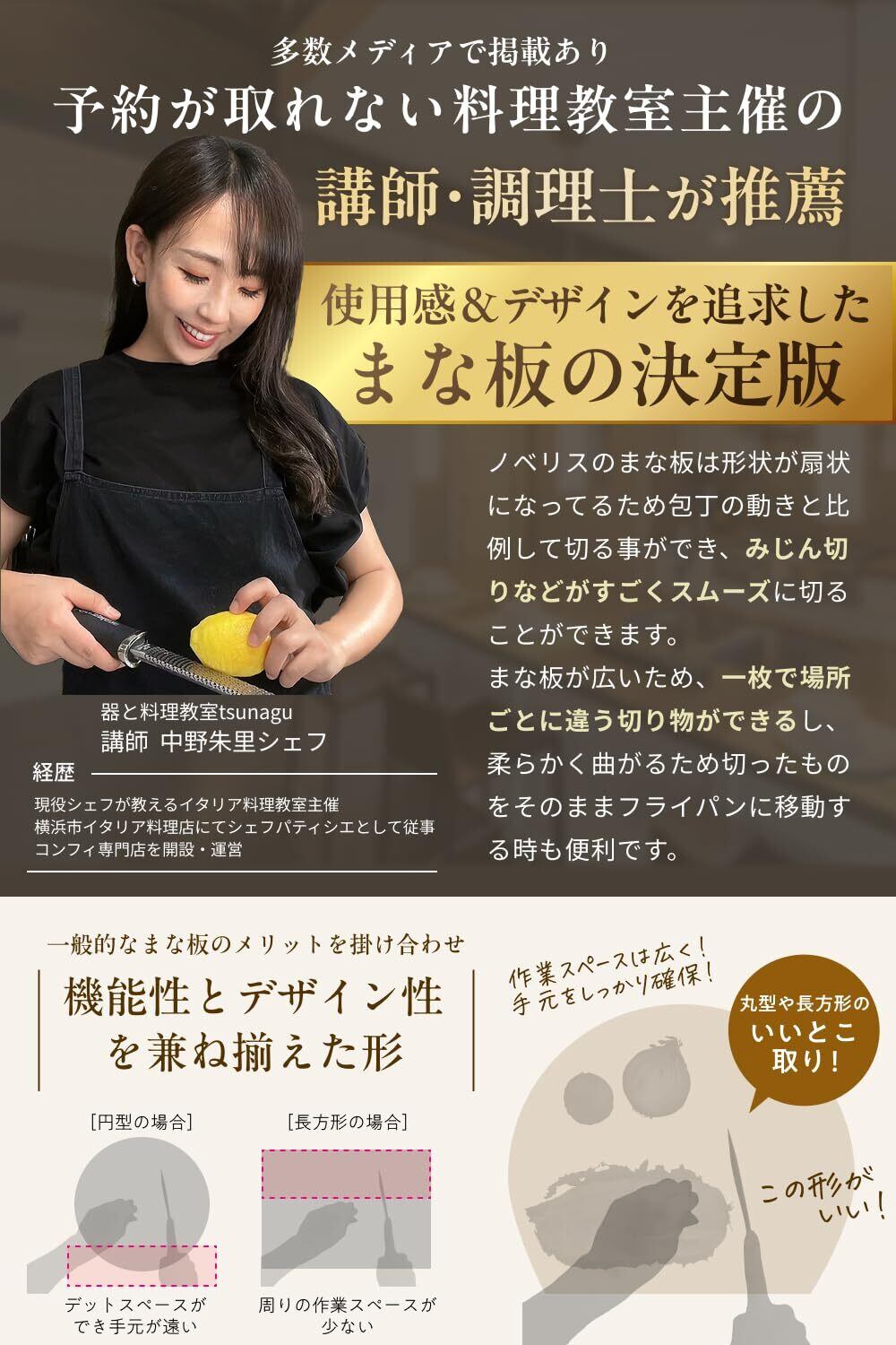 【素材・形状へのこだわり】柔軟性と耐久性に優れたエラストマー素材を採用しました。弾力性があるため切った食材を滑らせることなく使用することができます。形状はまな板の奥行を有効活用できるD型にカッティングしているため、キッチンの作業スペースを有効活用することができ調理効率を高められるためとても便利です。