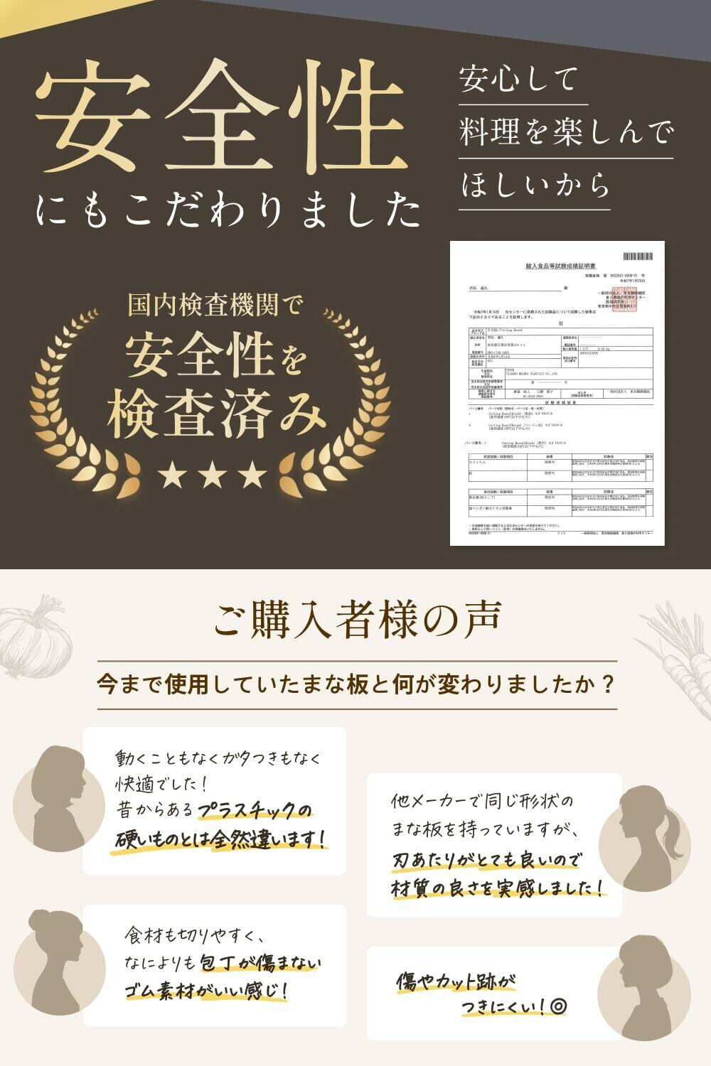 【食品衛生検査済】エラストマー素材を使用しているため包丁への当たりが柔らかく傷つきにくいため雑菌の繁殖リスクが低くなります。日本国内食品衛生基準もクリアしているので安心してご使用ください。