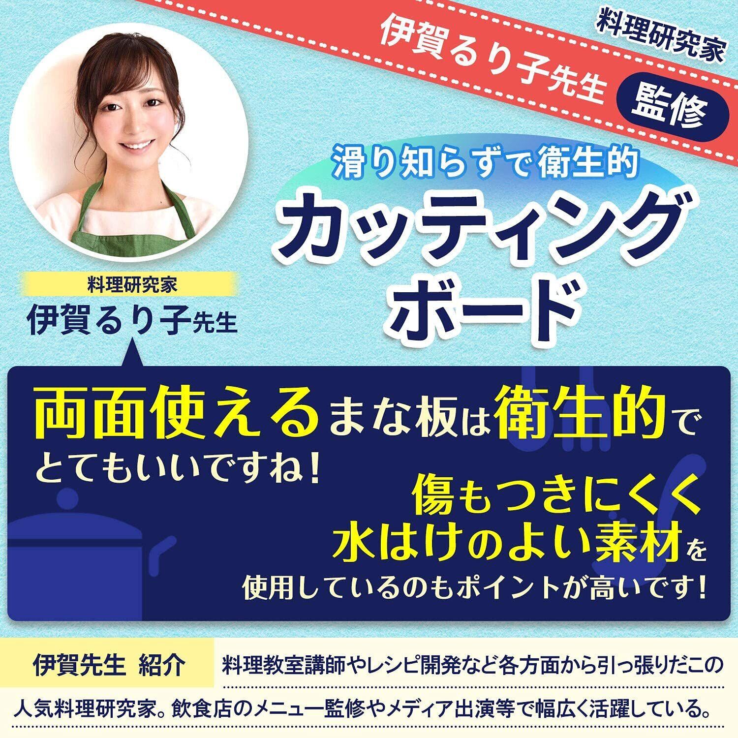 【商品基本仕様】主婦50人の「あったら良いな」という意見を反映し、1.滑らず 2.両面使えて 3.衛生的 な商品を開発致しました。生ものを切るときは表側・それ以外を切るときは裏側と分けて使えるから食中毒予防にもオススメです。形状が斜めになっているため、余計な水分が流れるので便利です。また、洗った後の水の切れは衛生的である証で、水洗い後ふきんで軽く拭くだけで水が切れてるためお手入れがとても簡単です。