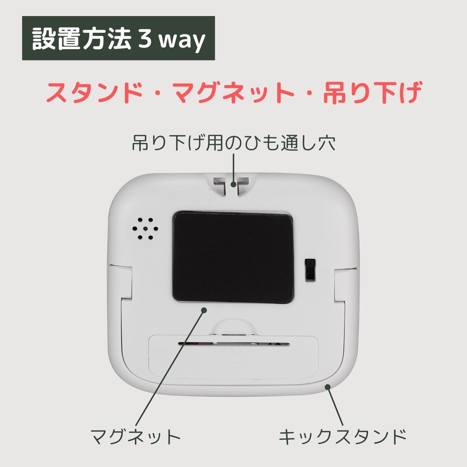 【3通りの設置方法】設置方法は、キッチンでの利用に便利な「マグネット」、デスクに立てて置ける「スタンド」、壁掛けなどを可能にする「吊り下げ」の3通りに対応しています。