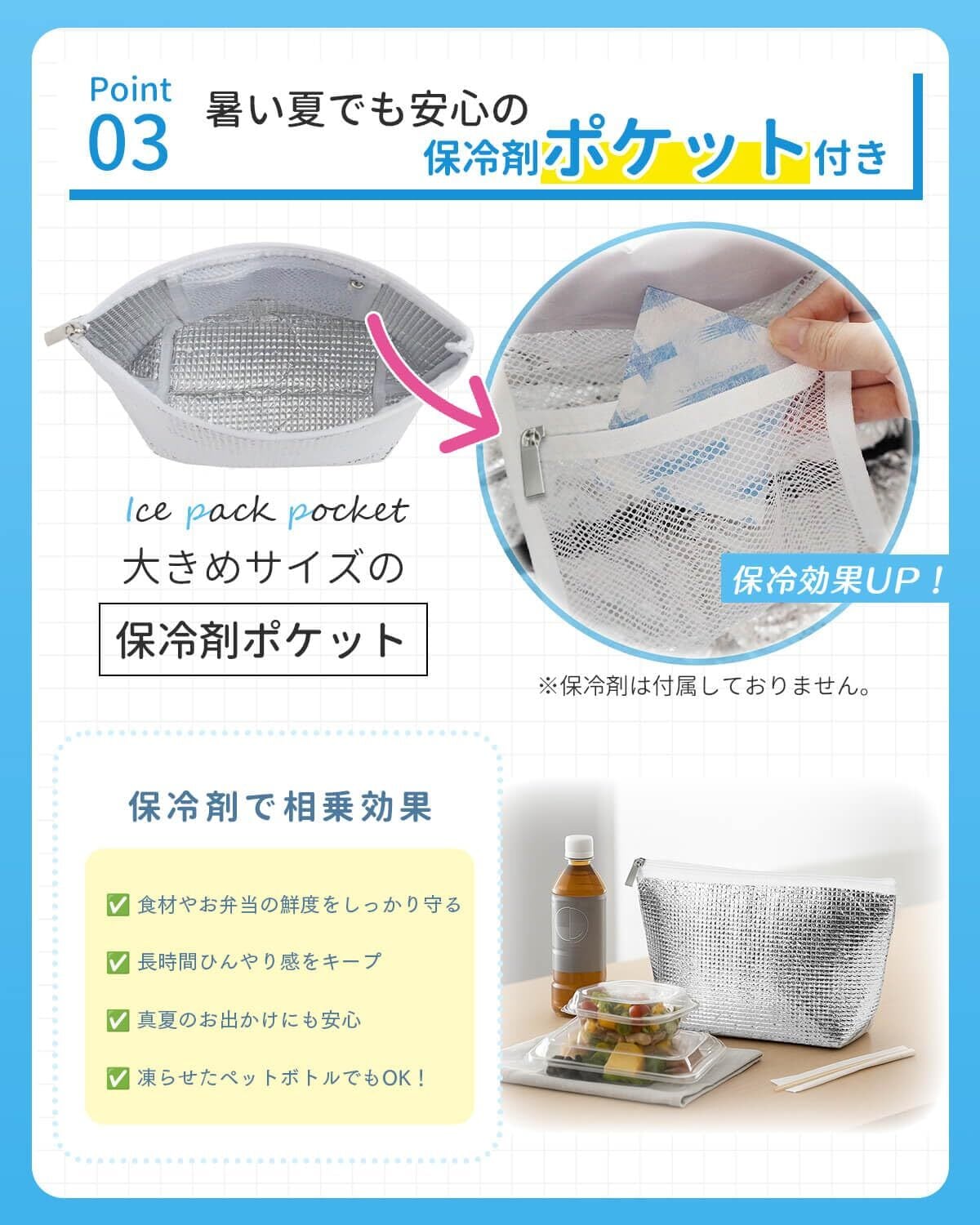 付属コンポーネント 主な保温部屋、保冷剤ポケット
