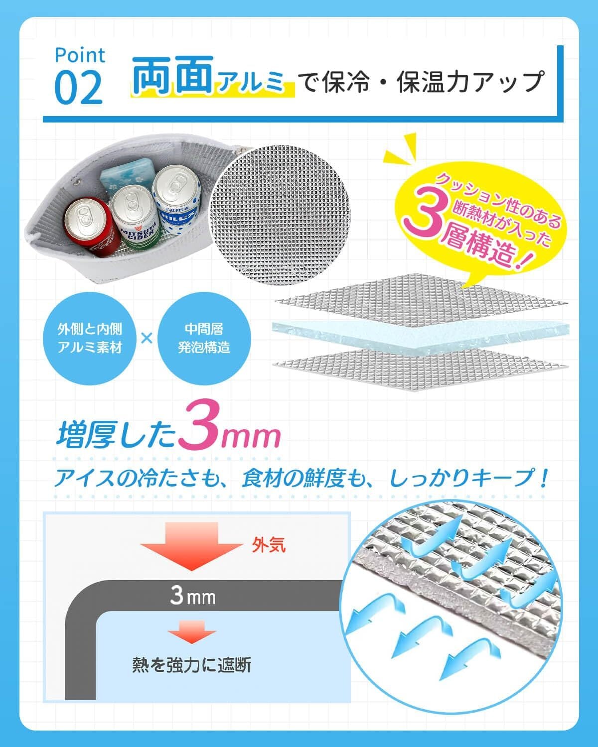 『極厚仕様・両面アルミ補強で抜群の保冷力』保冷力抜群!独自の3mmの極厚仕様を採用し、両面アルミ補強で食材をしっかり守る。暑い夏でも、お弁当や飲み物を長時間キープできるから、アウトドアやレジャーにも最適。SOMOTO 保冷バッグは大容量なのにコンパクトに折りたため、持ち運びや収納がラクラク。冷たいものを冷たいまま、手軽に運べるのが大きな魅力。
