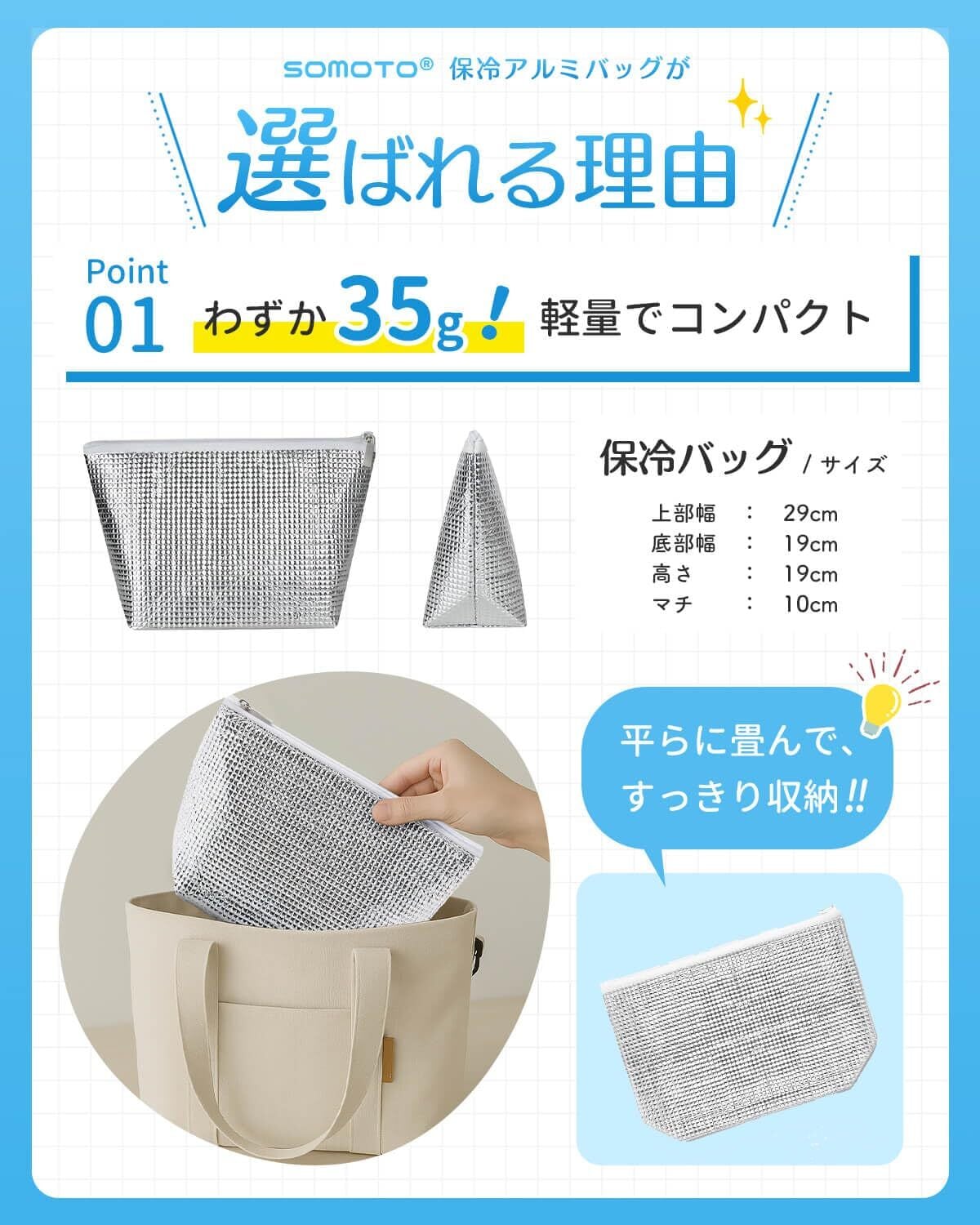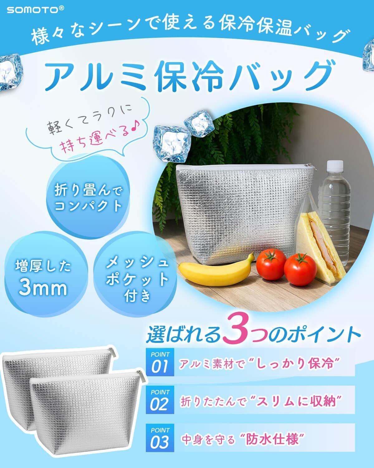『メーカー情報』SOMOTOは正式に権を取得しております(6564376)。独立した生産工場を持ち、すべての製品は出荷前に全品検査を行い、品質がされています。本商品は一年間のを提供しています。『商品仕様』SOMOTO 保冷バッグ ミニ 保冷袋[サイズ][上部幅]29CM[底部幅]19CM[高さ]19CM[マチ]10CM[色]シルバー[素材]外側と内側アルミ素材、中間層発泡構造