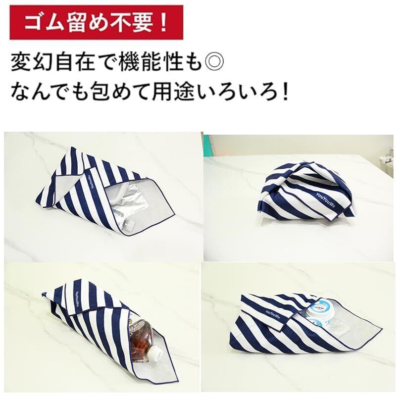 4.【お買い物の際、エコバックにプラスして便利に!】内側にアルミ蒸着フィルムがあるので、保冷剤と一緒に お弁当を包めば暑い時期も安心してお弁当を持ち歩けます。10時間後も氷が残る!冷蔵商品やアイスクリームなどの保冷にもお使いいただけます。 使わないときは畳んでコンパクトに持ち歩けるのも魅力の1つです。 ※表生地同士、裏生地同士だとくっつきません。