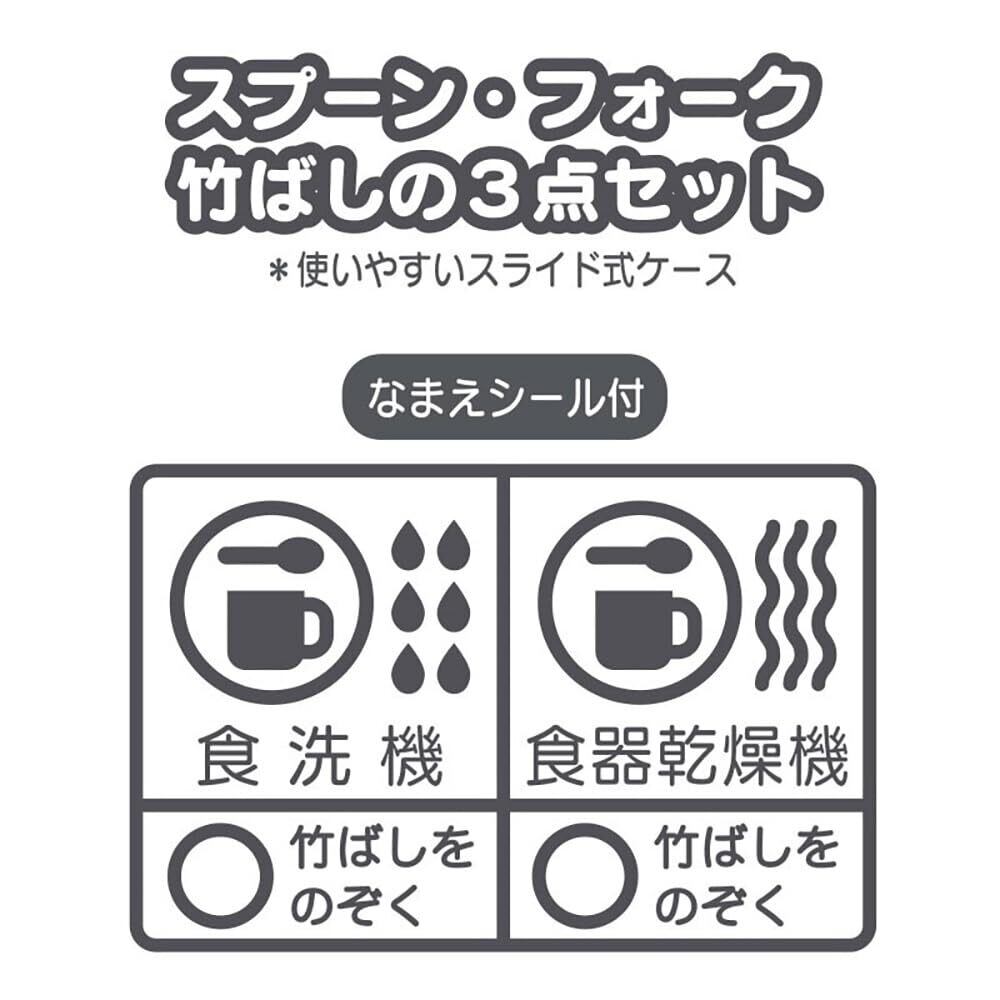 スプーン・フォーク・竹ばしの3点セット。使いやすいスライド式ケース。箸:すべりどめ付き。名前シール付き。抗菌。食洗器、食器乾燥機使用可能(竹ばしを除く)。煮沸はお避けください。