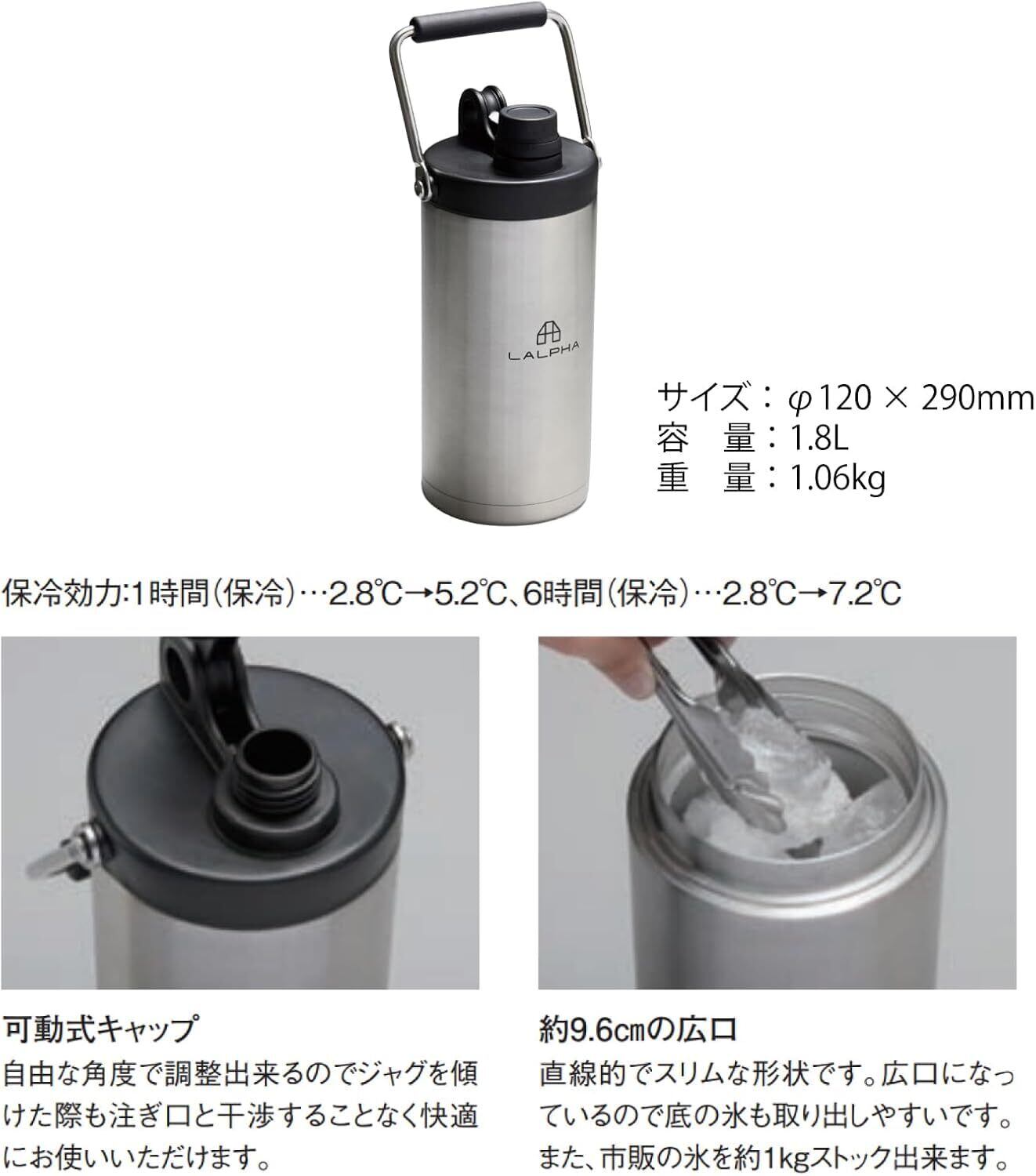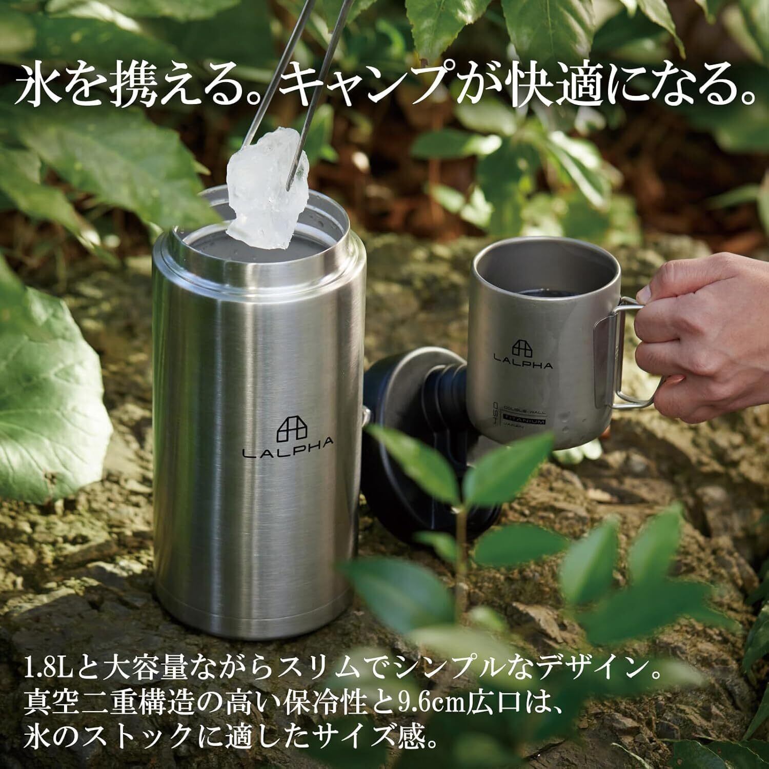 LALPHA (ラルファ) アイスジャグ アイスコンテナ 保冷 保温 真空 断熱 氷 ICE Cold Hot対応 ステンレス キャンプ アウトドア (1.8L ブラック)
