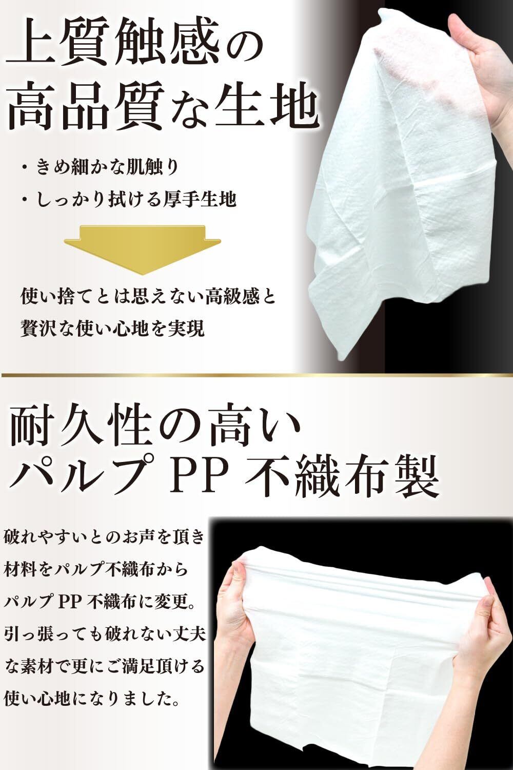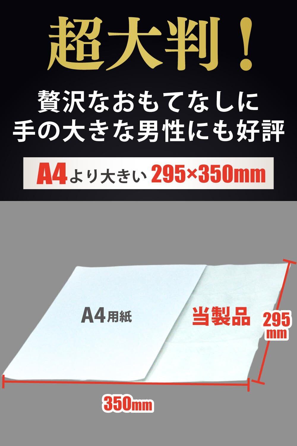【超大判】両手に余るほどの大きさにこだわりました。特に、厚手でしっかりとした拭き心地と、使い捨てなので汚すことを気にせず拭ける使い勝手は、男性のお客様の満足度が大変高くなっています。