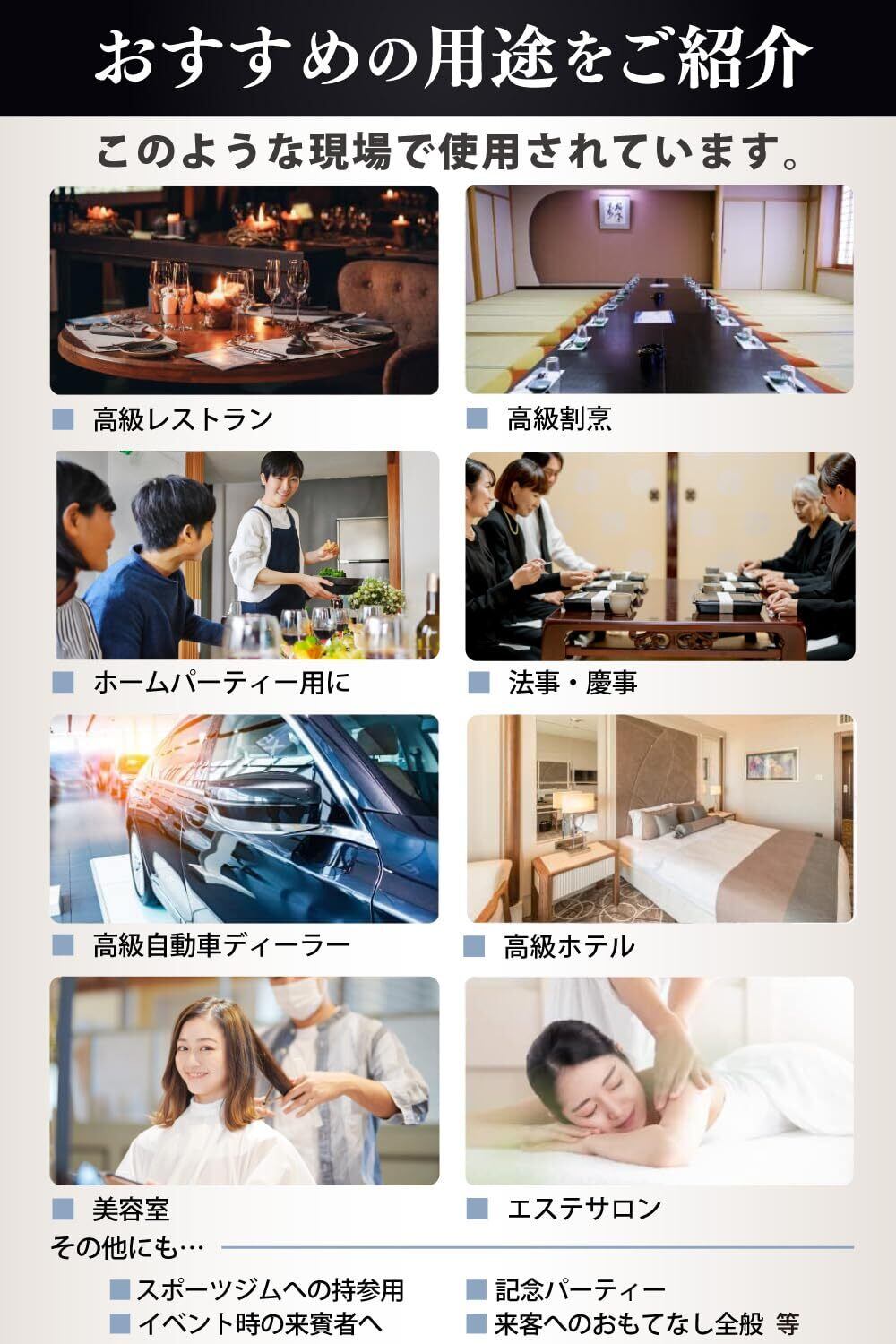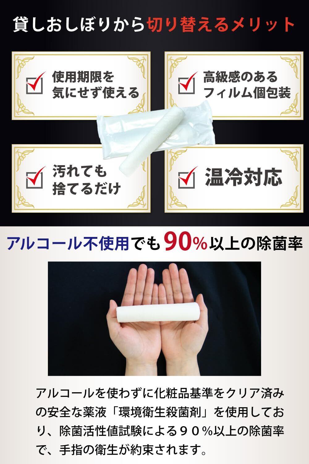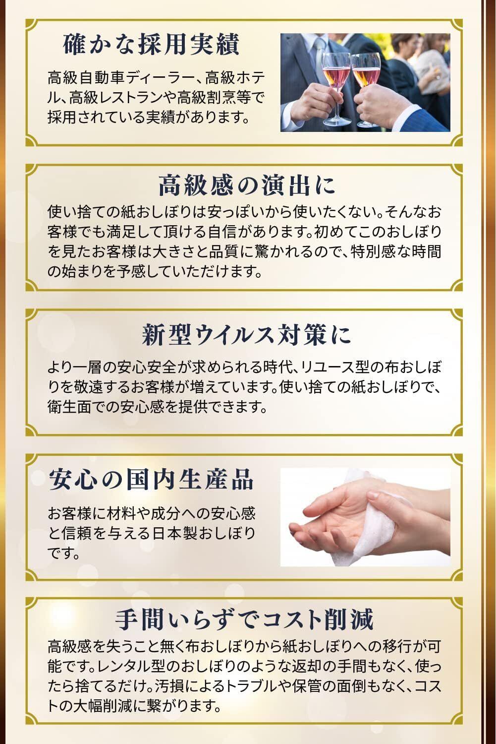 【抗菌】アルコールを使わずに化粧品基準をクリア済みの安全な薬液「環境衛生殺菌剤」を使用しており、除菌活性値試験による90%以上の除菌率で、手指の衛生が約束されます。新型ウイルスにより、より一層の安心安全が求められる時代、リユース型の布おしぼりよりも使い捨ての高級おしぼりはいかがでしょうか。