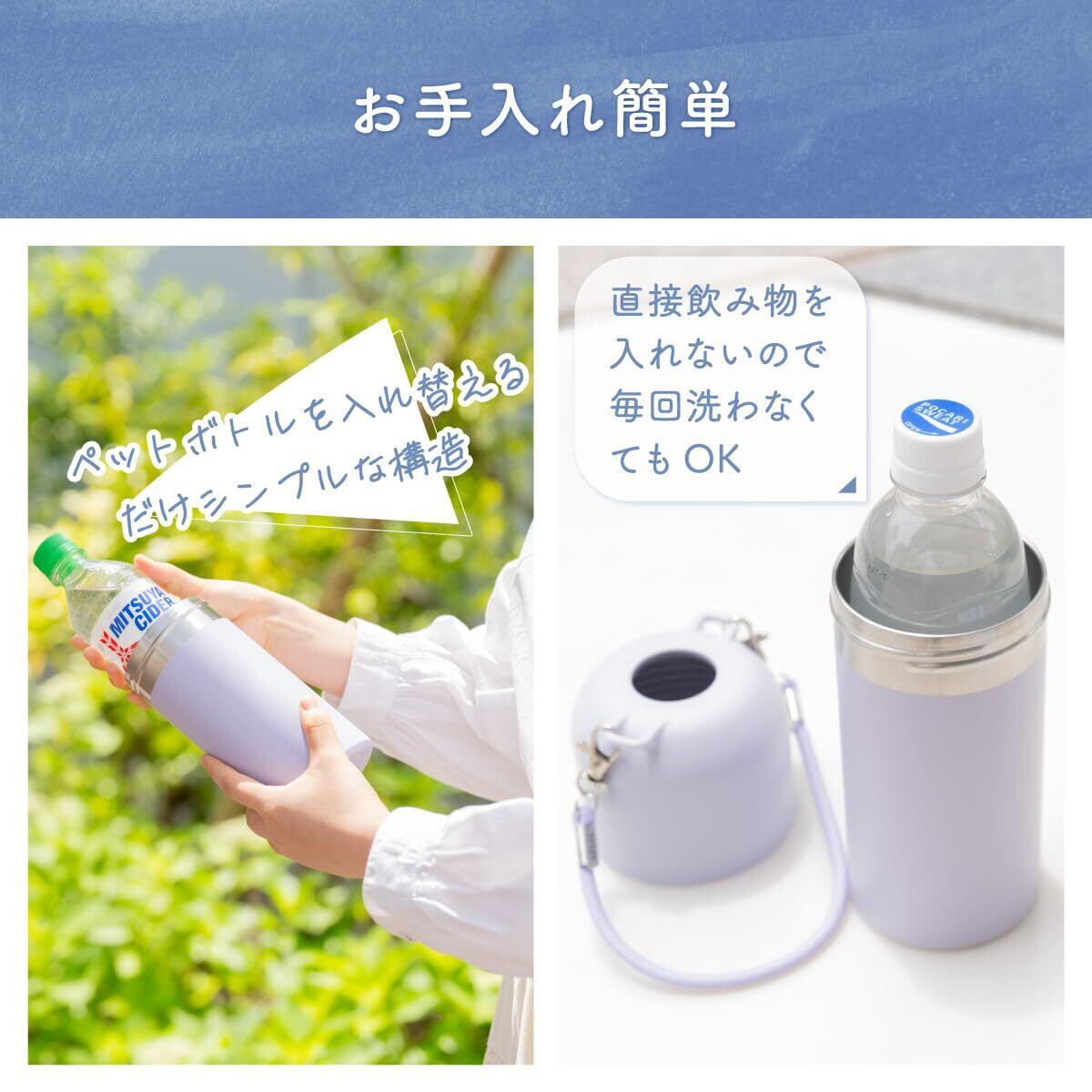 500mlから650mlサイズのペットボトルに対応。便利なストラップ付き