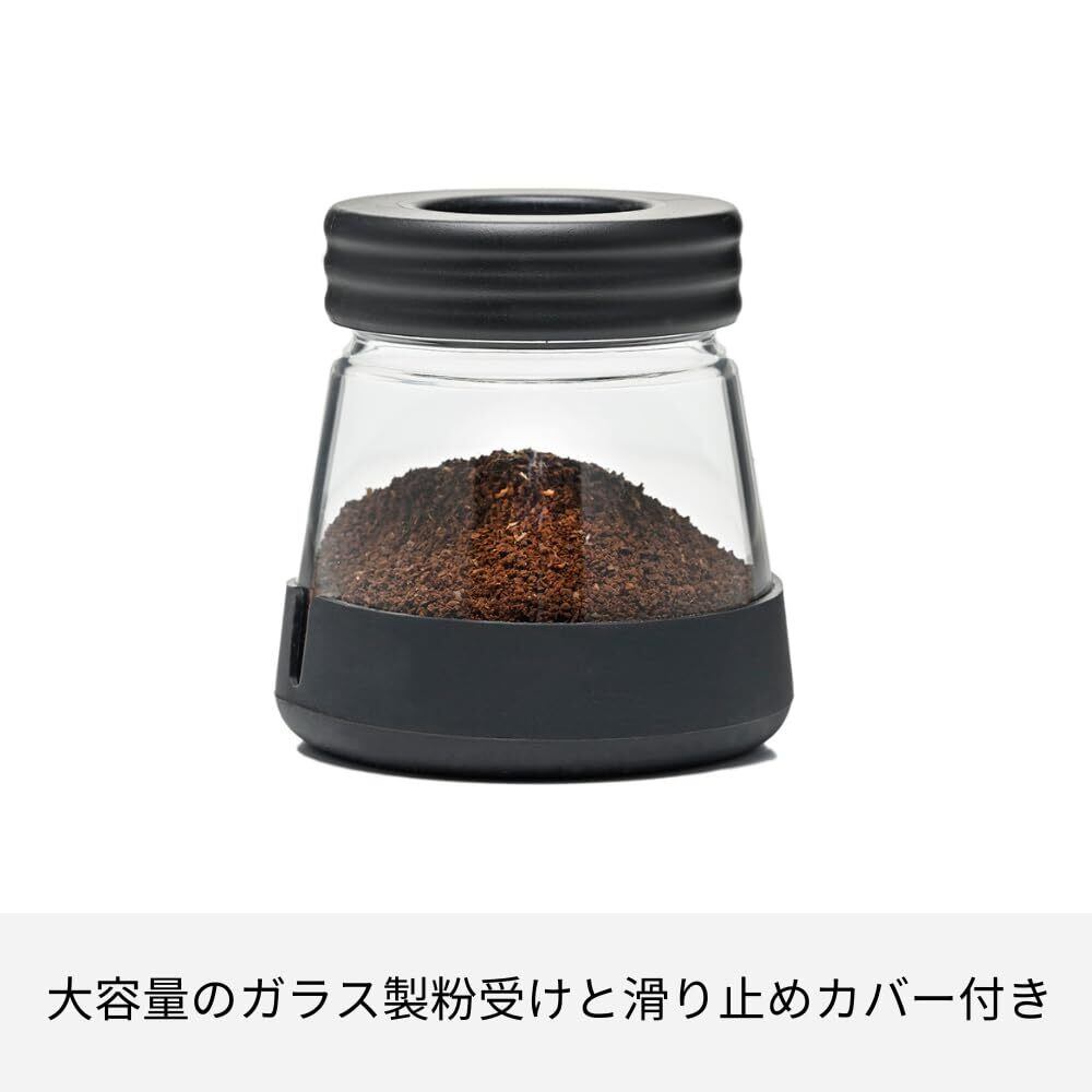 【滑り止めカバー付き】大容量のガラス製粉受けと滑り止めカバー付きです。100gまでのコーヒー粉をいれることができる、大容量の粉受けを使用したコーヒーミルです。滑り止めカバー付きなので安定してコーヒーを挽くことができます。