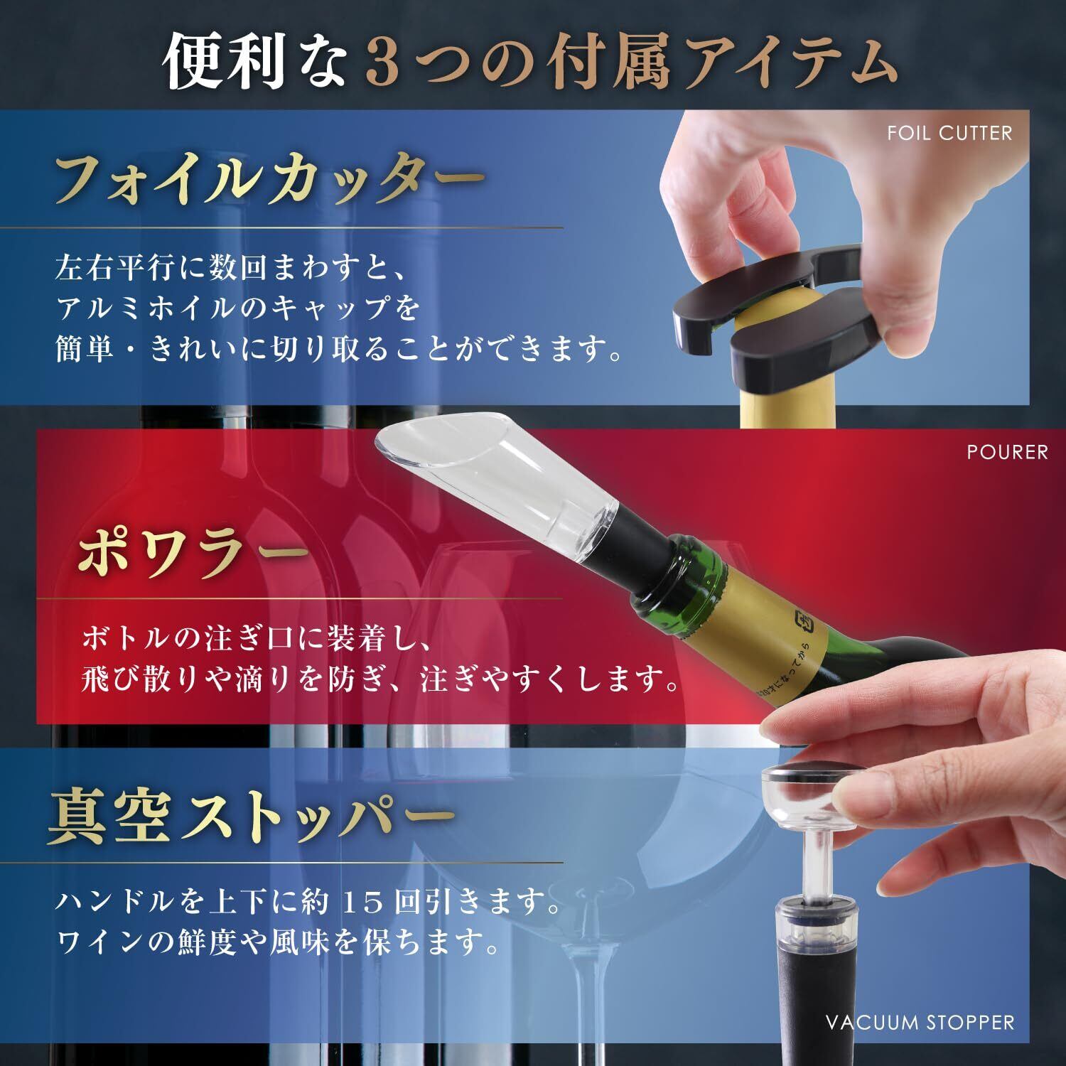【便利な3点セット付き】 フォイルカッター、ポワラー、真空ストッパーがセットに!ワインを開けるだけでなく、注ぎや保存までしっかりサポートします。