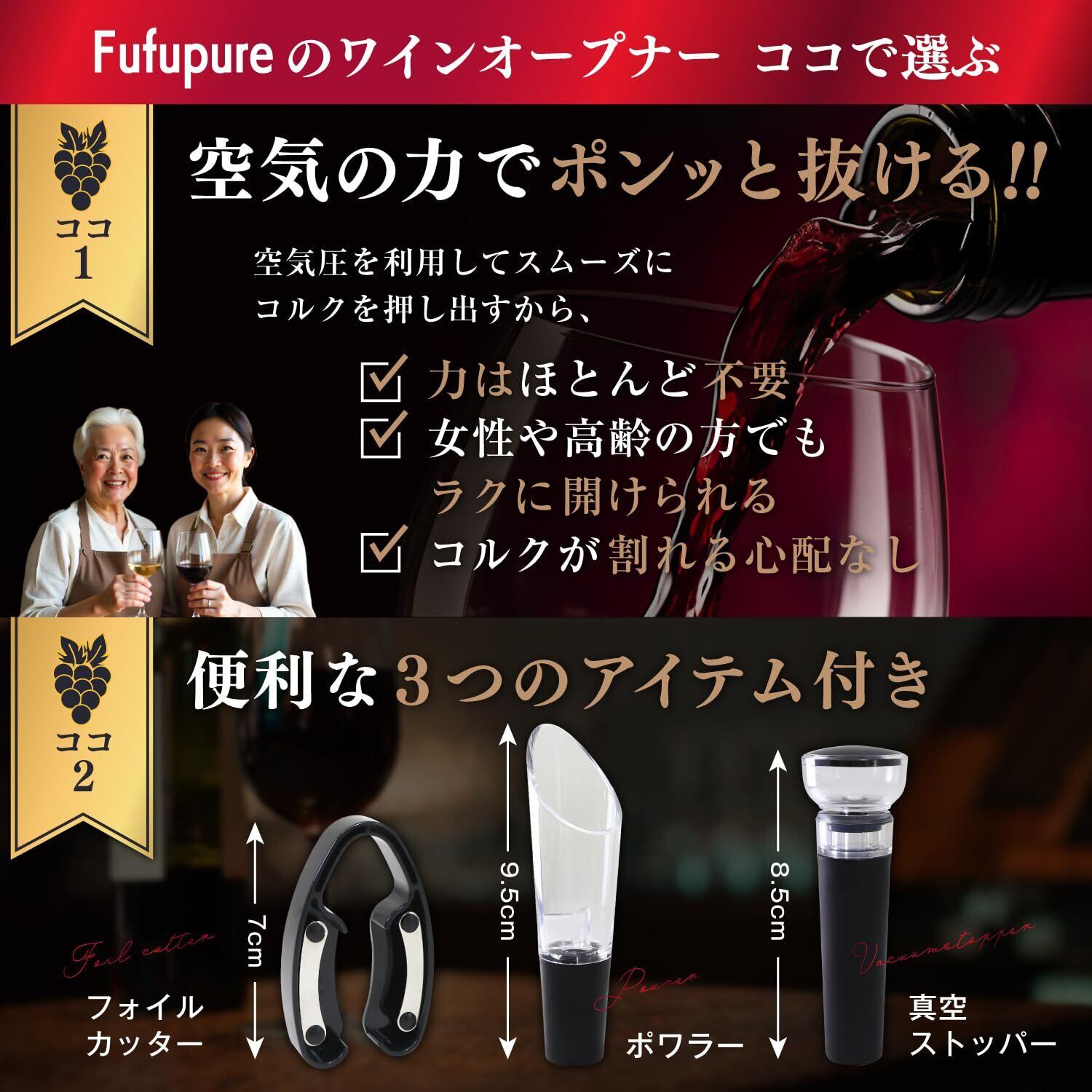 【ソムリエ・エクセレンス監修】 ワインオープナー コルク抜き 【エアーポンプ式で簡単x便利な4点セット】【ホイルカッターx真空ストッパーxポワラー付き】電池不要 Fufupure