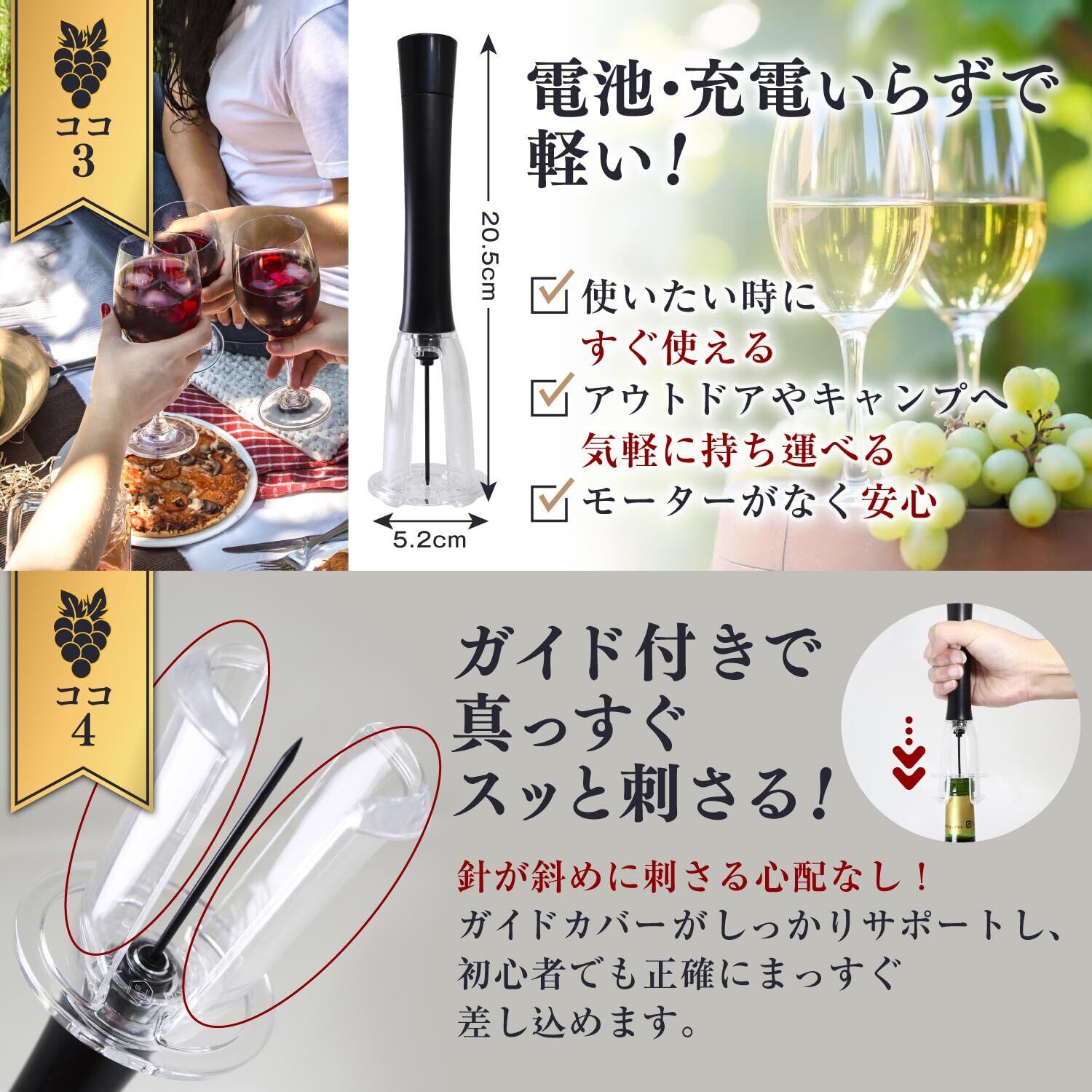 【電池不要&軽量設計】 充電や電池交換の手間なし!軽量で、アウトドアやキャンプにも気軽に持ち運べます。モーター不使用な ワインオープナー です。